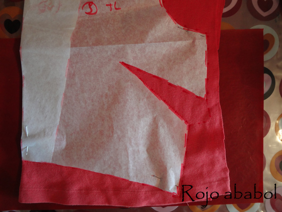 Ponemos debajo de la tela el papel de calco con la cara que mancha hacia arriba, no importa que no ocupe toda la tela, ya lo iremos moviendo.