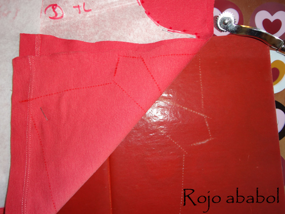 Ahora solo tenemos que pasar la ruleta por encima de la marca que tenemos presionando un poquito para calcar al otro lado. Vamos desplazando el papel de calco bajo la prenda conforme necesitemos.