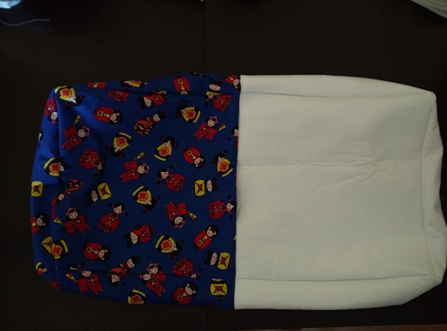 Una vez tengas las dos bolsas cosidas hay que unirlas, para ello, metemos dentro la bolsa interior con el derecho hacia fuera, y la tela estampada con el derecho hacia dentro, y tendrá que quedarte algo así.