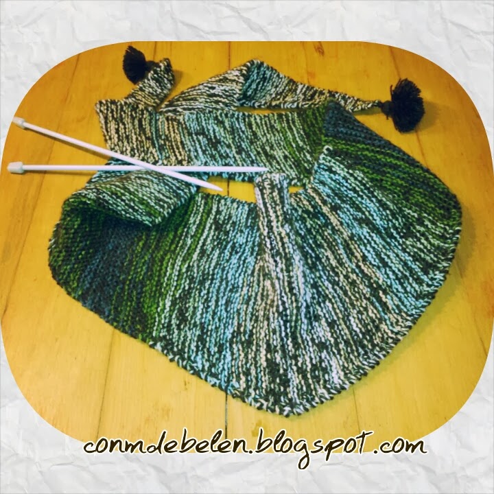 Y la que mas me gusta de todas, mis dos metros de bufanda Baktus, hecha con dos agujas, siguiendo el patron de Ana, de LANAS DE ANA, con un pequeño cambio, aumentando cada seis vueltas, para que el pico central quedase mas pequeño, el resultado, como ya he dicho antes, ME ENCANTA!!!!!!!!!