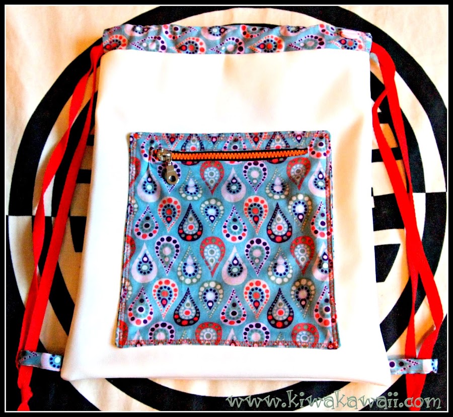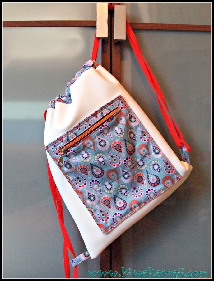 Es una mochila pequeña, con un bolsillo exterior con cremallera y uno interior sencillo. Tanto la polipiel blanca como la tela de gotas son de Cal Joan. La cinta de espiguilla roja y la cremallera son del Mercat dels Encants y lleva una plaquita de madera "handmade" en un pasacordón.