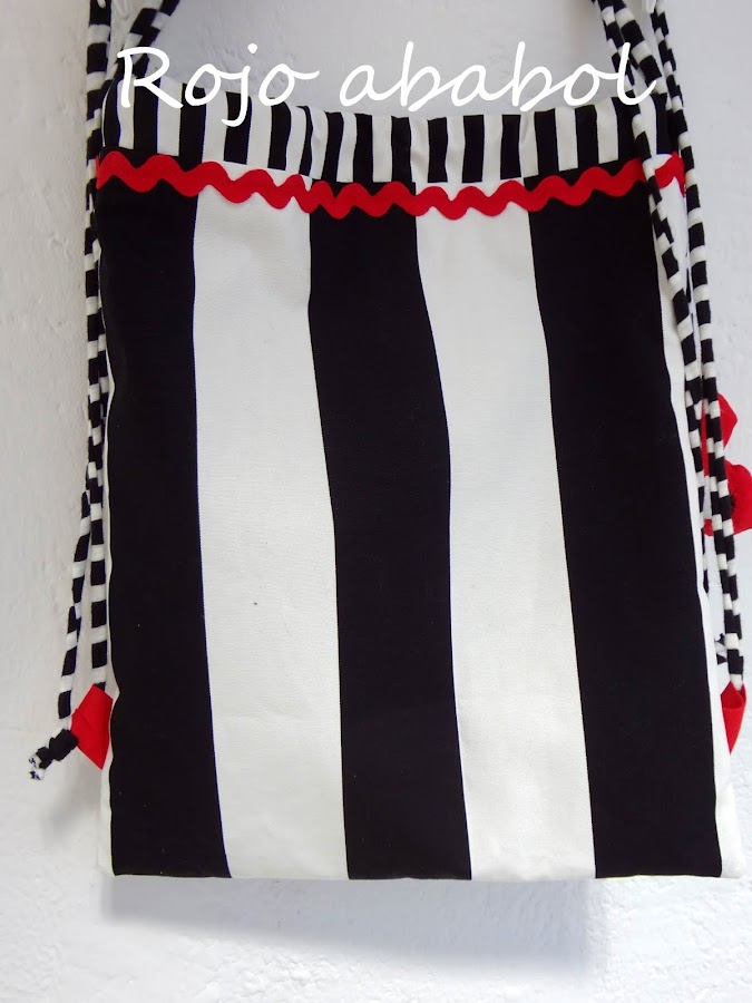Telas de loneta de Ikea, rayas anchas y finas en blanco y negro para el exterior. Algo de decoración para romper en mi color, rojo muy rojo! Y tirantes de trapillo, rayados muy rayados... jejeje
