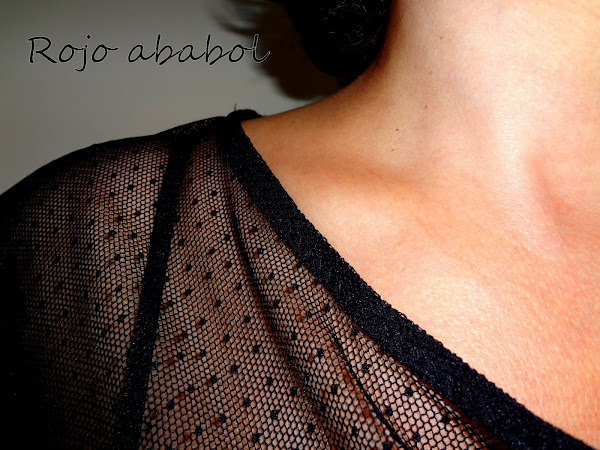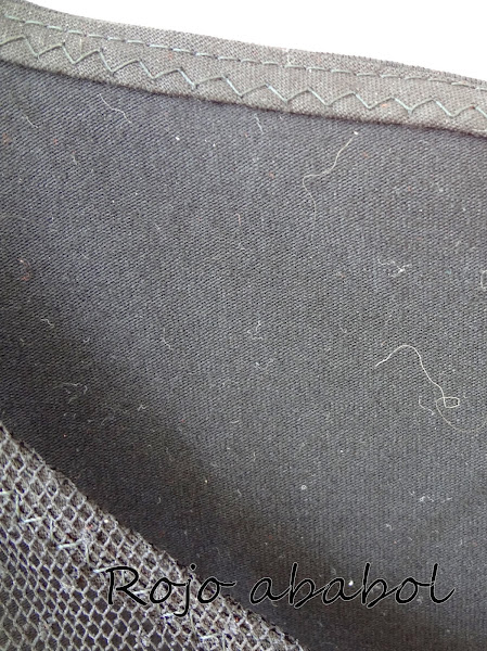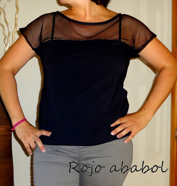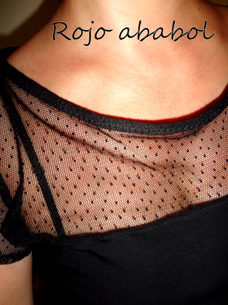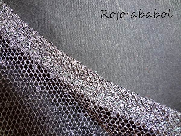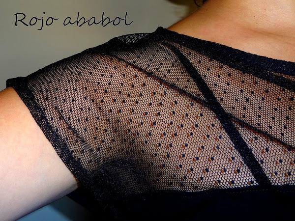 Combinando dos telas, como indica el patrón, pero en mi versión uso tela de camiseta negra y ... alguien sabe cómo se llama esta tela? Elástica, transparente y enrejada... Eso si, se cose genial!!