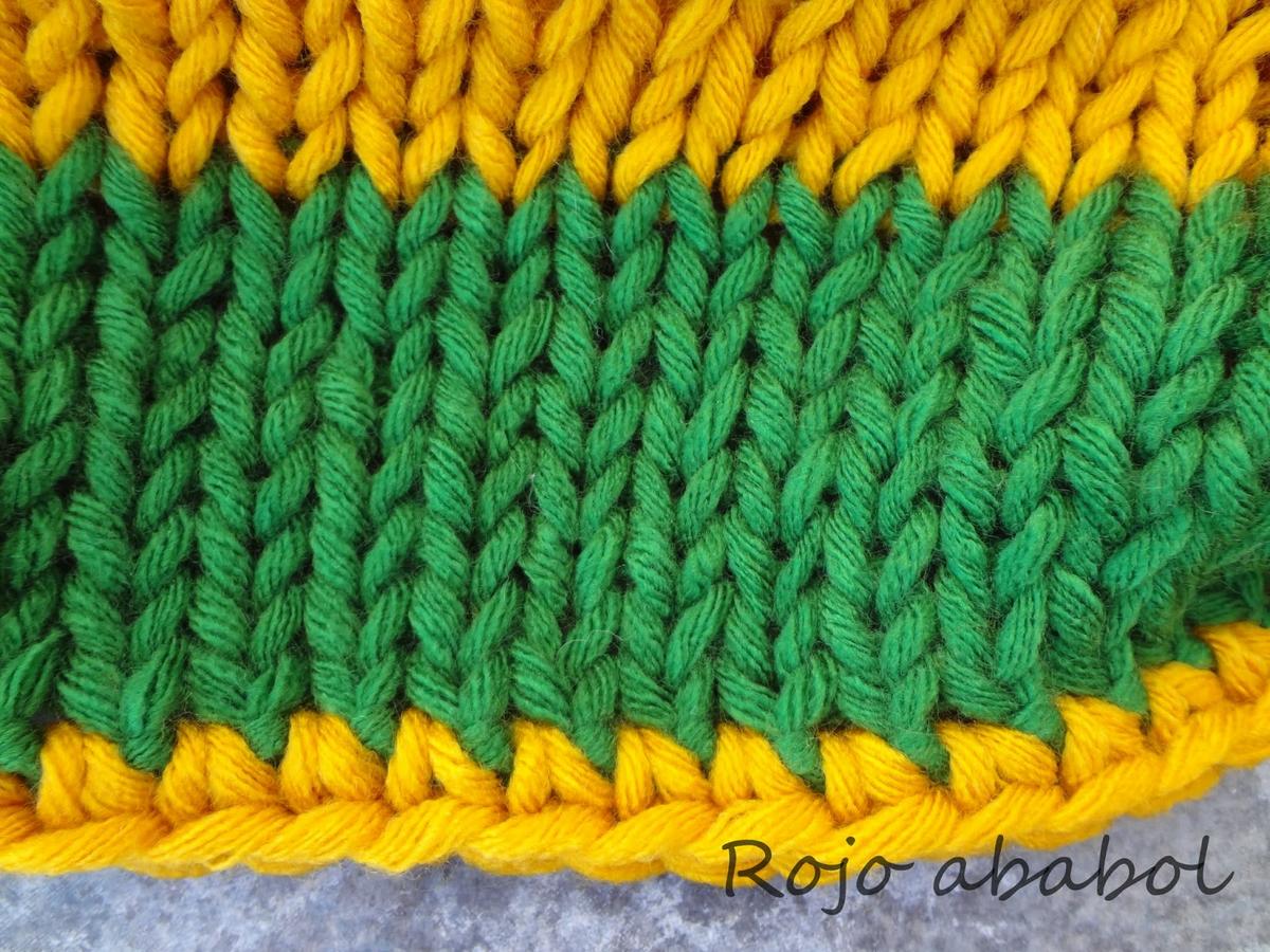 Se trata de un hilo grueso, con un tacto realmente sueve y muuucho peso. Está tejida con agujas del número 12, para que os hagáis idea del grosor del hilo.Cada línea un ovillo, empezando por la verde oscura, punto de espiga o jersey, una vuelta del derecho y la siguiente del revés....