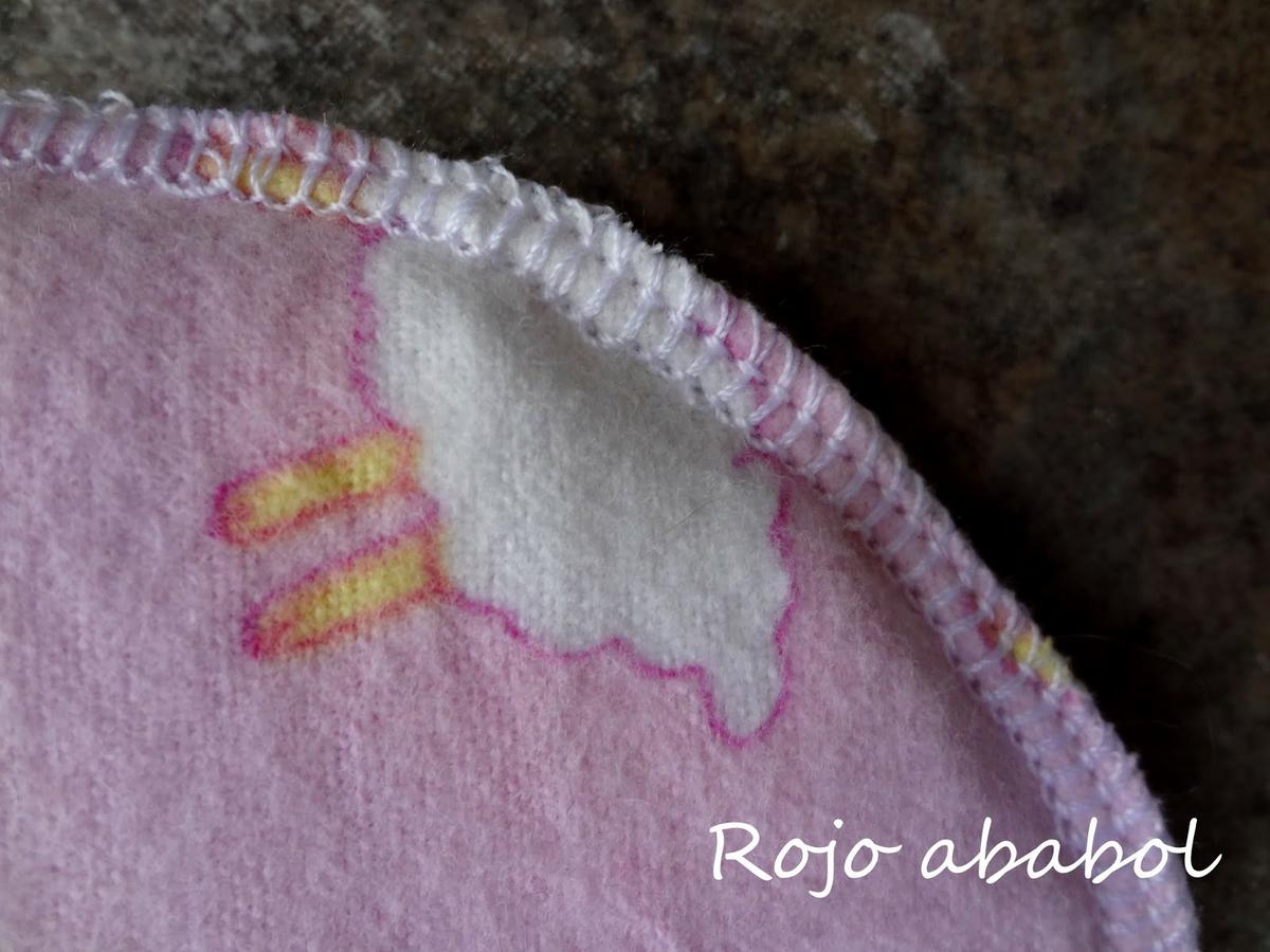 Os cuento un poco cómo los hice. Recorté cuatro círculos de 12 cm de diámetro en cada uno de los siguientes materiales y colocados en este orden: Polar finito en contacto con la piel, toalla, protector de colchón impermeable/transpirable y franela decorando el exterior.