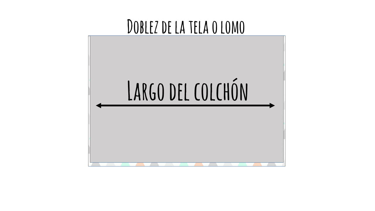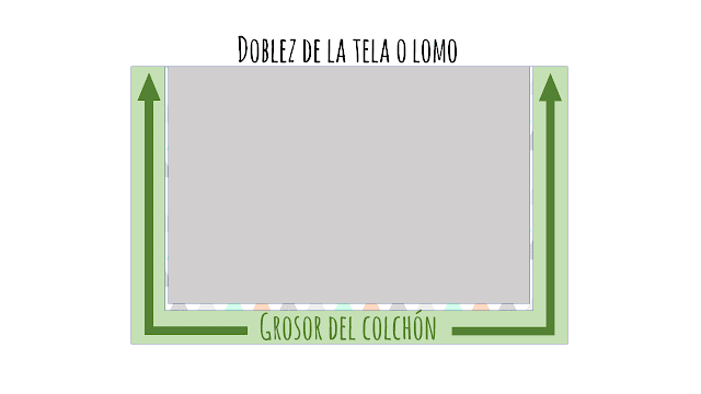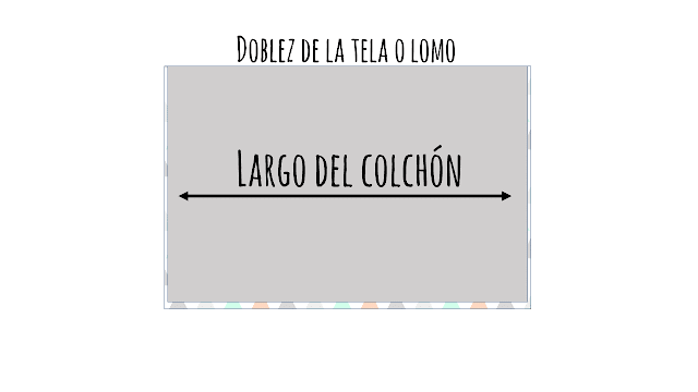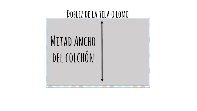 Empezaremos midiendo el alto, el ancho y el grosor del colchón y estas medidas las pasaremos a la tela para empezar a sacar nuestro patrón. Doblamos la tela por la mitad, para generar un lomo y marcaremos el ancho y la mitad del largo ( desde el lomo ). Ahora añadiremos a todo el contorno la medida del grosor del colchón y unos 5-6 cm más para el carril que usaremos para meter la goma.
