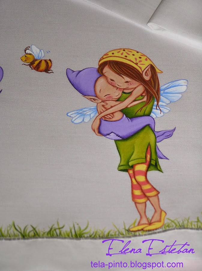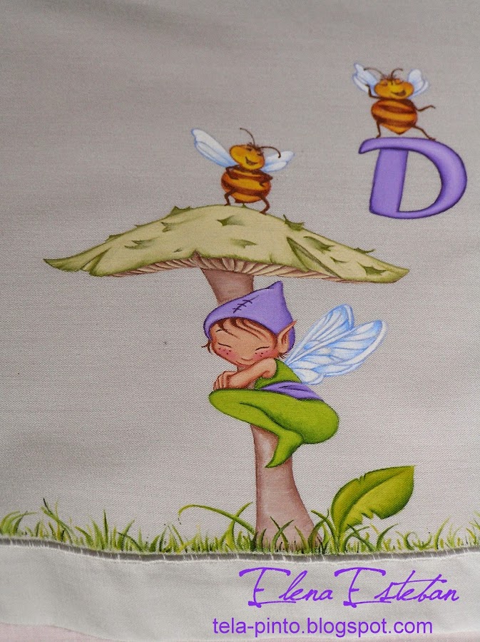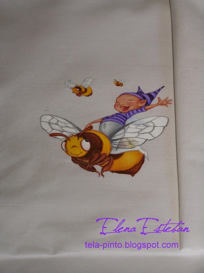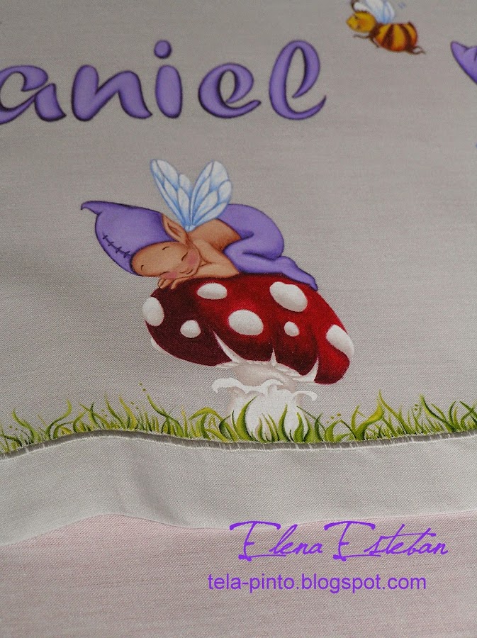 Huyendo un poco del rosa bebé, me planteé este trabajo en un verde vivo.Sabana y almohadón para cuco, y una bolsita para guardar el chupete. Imagen del proceso del pintado de la tela.Primero pinto los detalles mas pequeños, para que no pierdan la expresión con las sucesivas capas, y que el resultado final mantenga la expresión divertida de estos personajes.