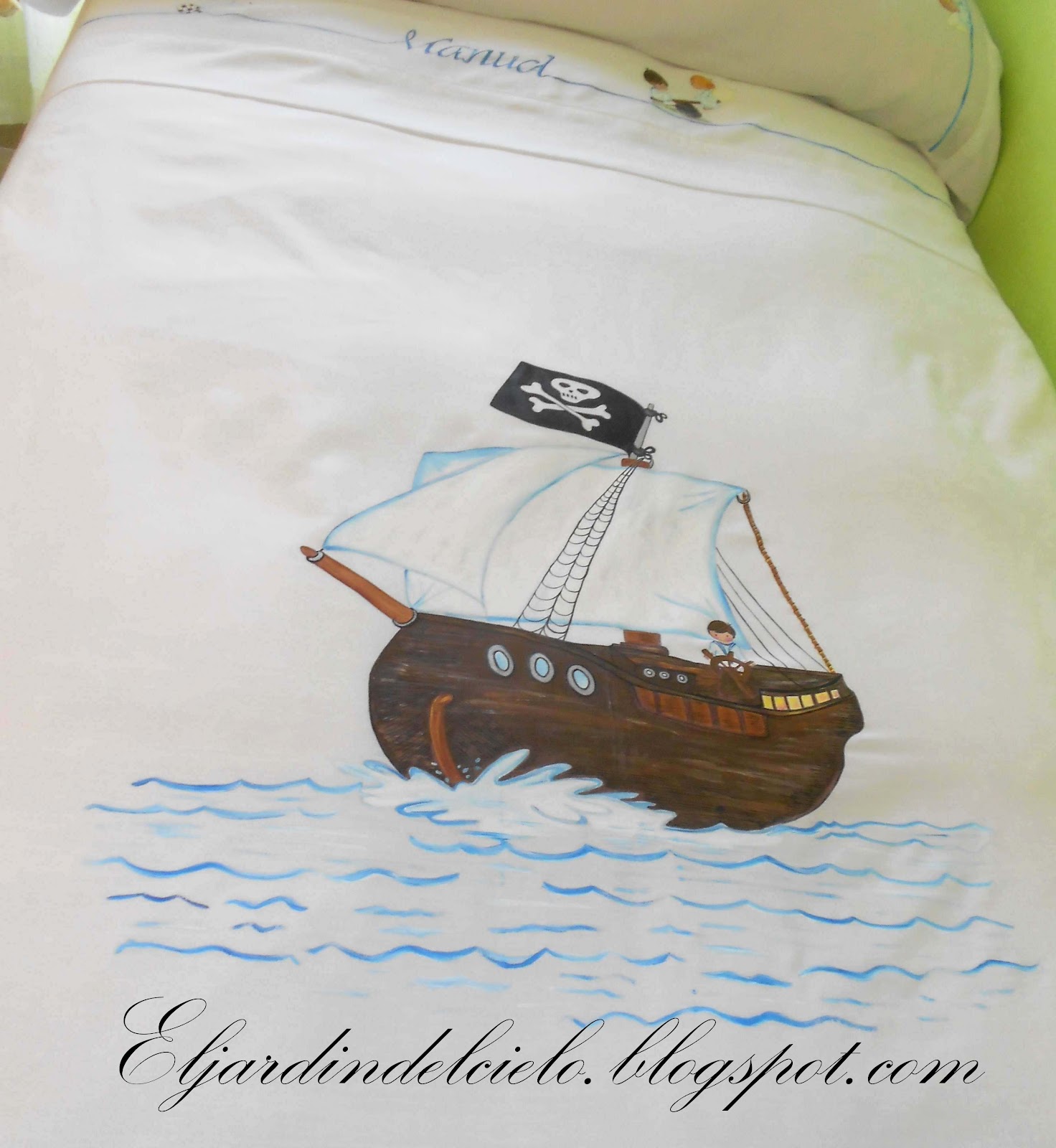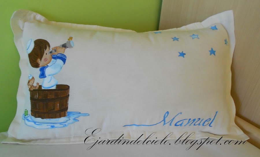 Este año (concretamente el día 27 de mayo)? tenemos LA COMUNIÓN. Sí, así en mayúsculas porque hace la primera comunión el mayor de mis sobrinos que tiene un mes más que mi hija a la que aún le queda un año porque en el colegio la hacen en 4º. Pues además de nuestro regalo, le he pintado toda esta ropa para su cama que me ha tenido ocupado toda esta semana, incluso algun día hasta las 4 de la mañana.