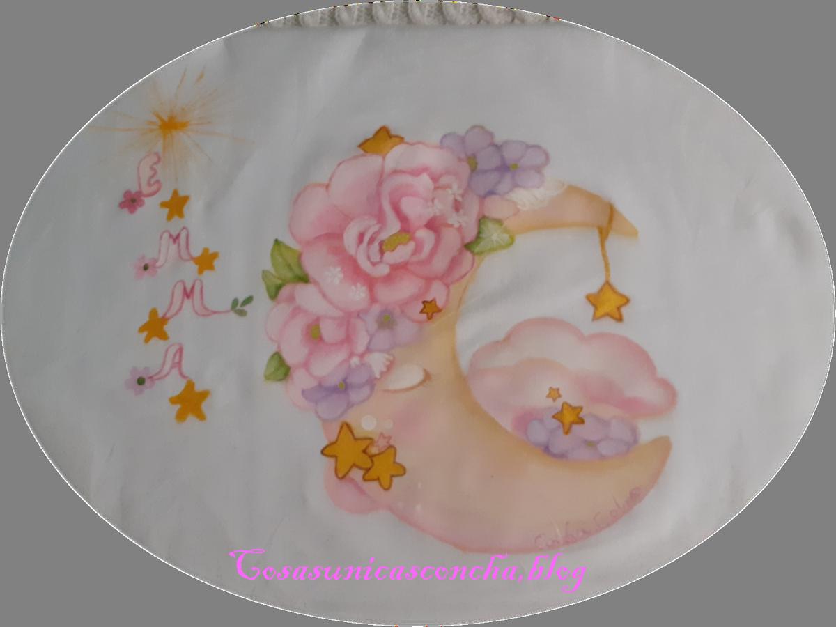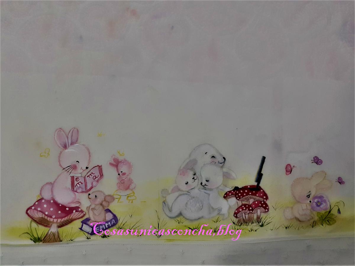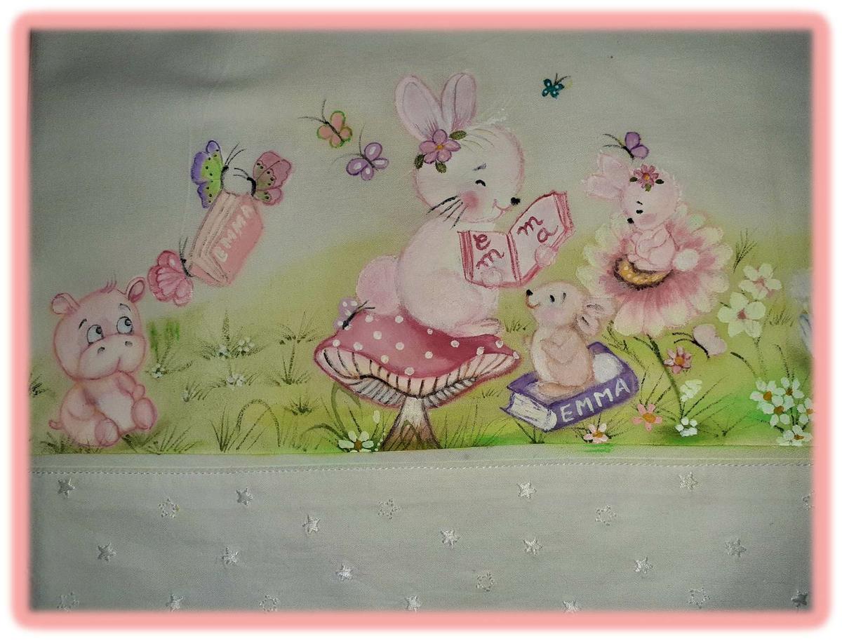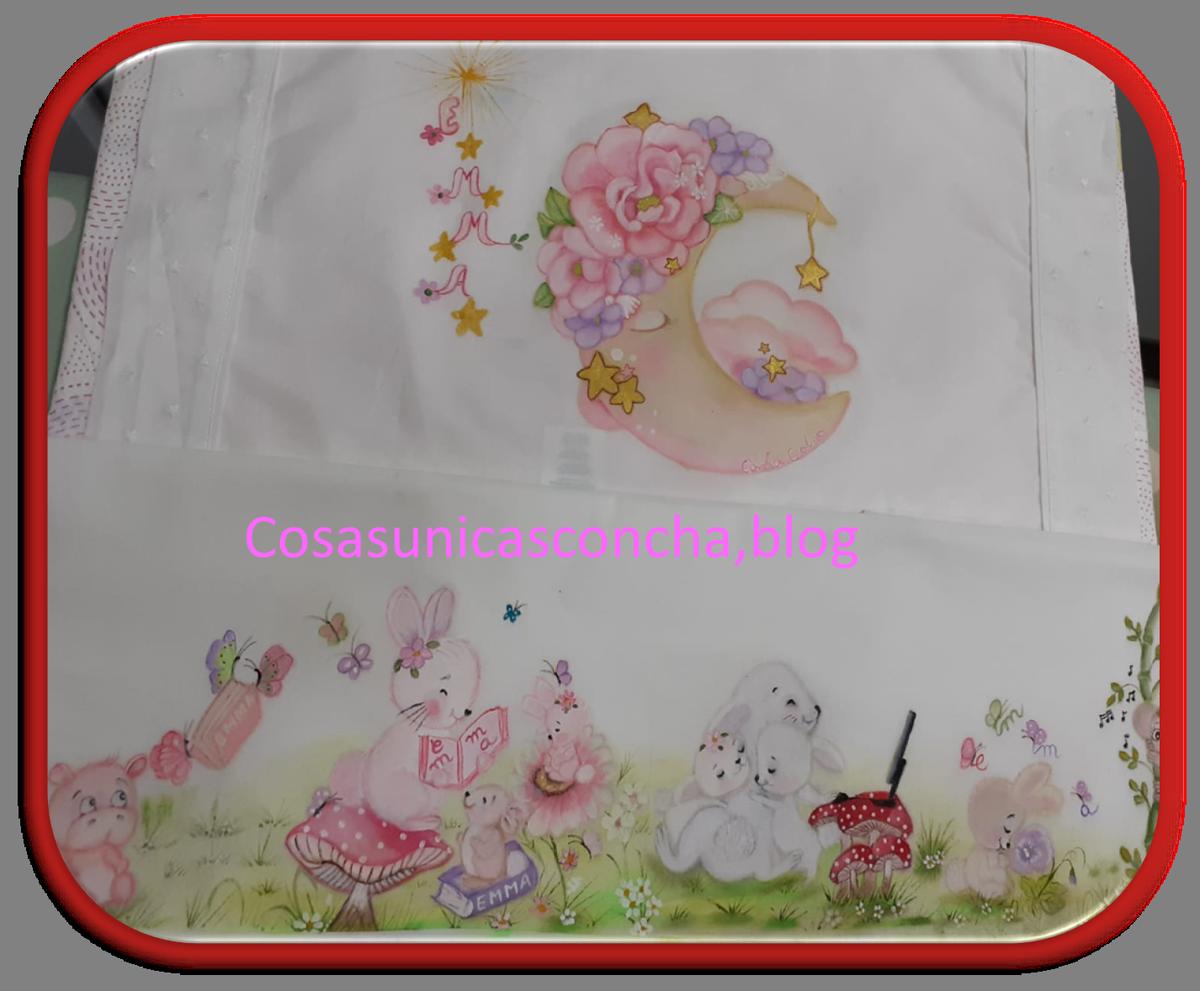 Estas sabanitas ya os he contado que son para Emma, la sobrinita de Ana, a la que me une una amistad de muchos años y por la que empece a pintar las sabanitas “” de cuento””.