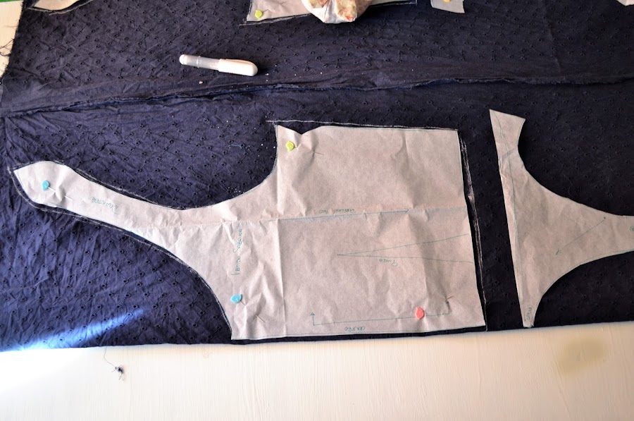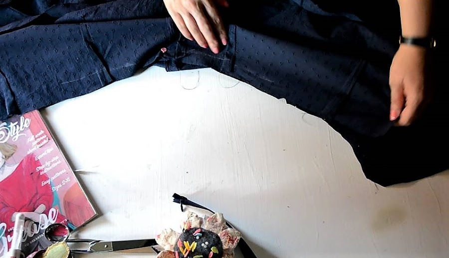 Una vez que tenemos los patrones, doblamos la tela derecho contra derecho y por la parte del revés ponemos nuestros patrones. Yo he doblado una orilla hasta el centro y la otra también, he cortado las dos partes del delantero y las dos partes de la espalda, luego he cortado también dos veces el patrón de la falda, una para el delantero y otra para la espalda.