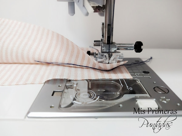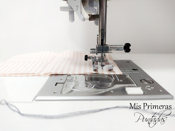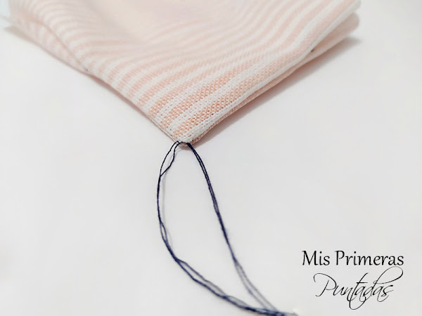 Cogemos un hilo doble (podemos reaprovechar aquellos que terminamos quitando al descoser) y lo colocamos contra la aguja y entre las dos telas, como si fuera el queso de un sándwich.