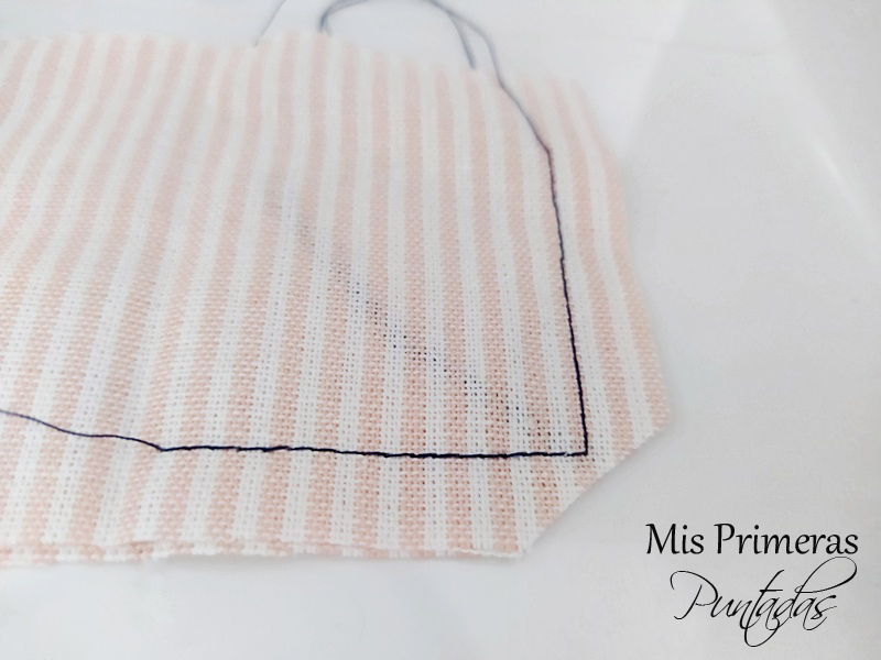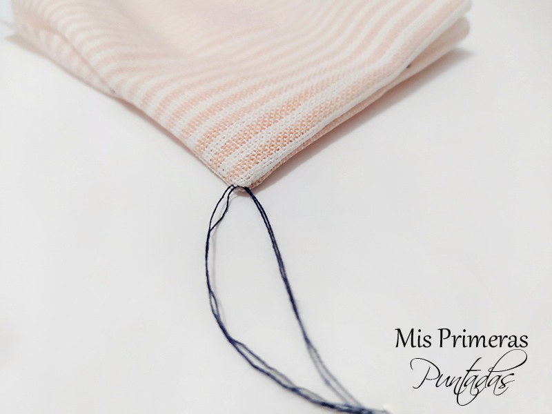 Ahora, sujetamos el hilo doble que intercalamos entre puntada y puntada y damos suaves tirones hasta sacar la esquina completamente.