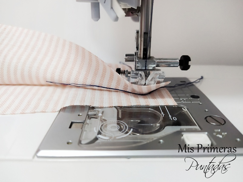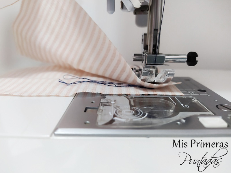 Al finalizar la penúltima puntada antes de llegar a la esquina, paramos de coser dejando la aguja hacia abajo.