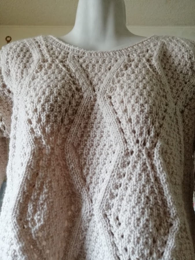 Es una talla M para lo cual monté 104 puntos en cada pieza (espalda y delantera).