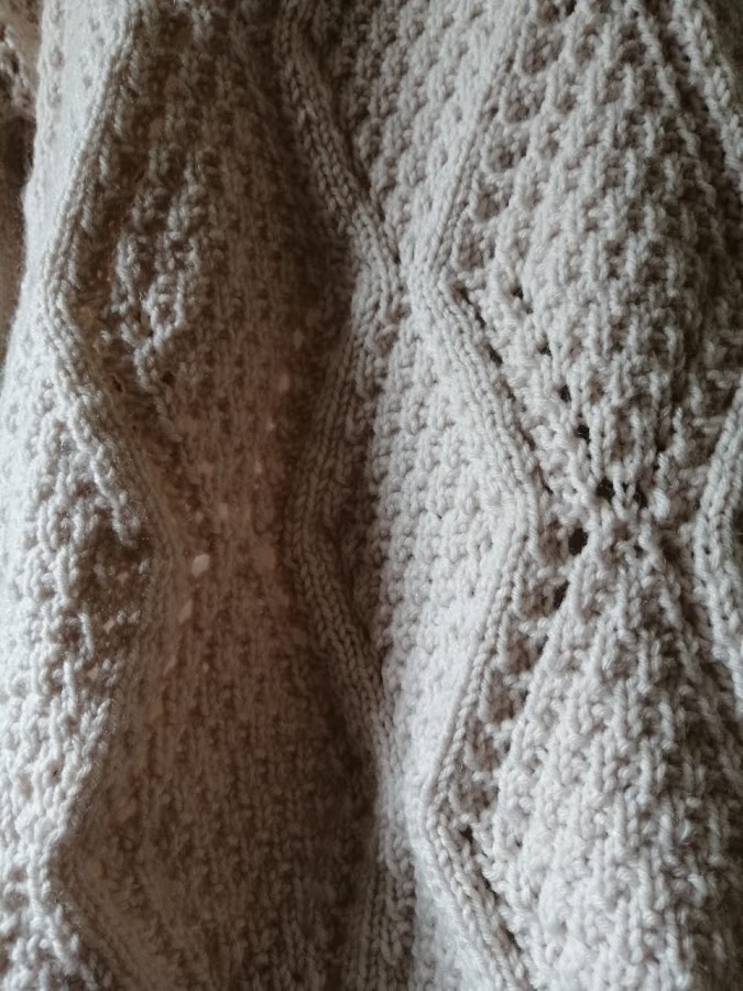 Para las mangas monté 52 puntos, hice un elástico de 10 vueltas 1 der y 1 rev, luego teji 10 vueltas de punto calado y a partir de aquí fui haciendo un aumento a cada lado cada 10 vueltas.