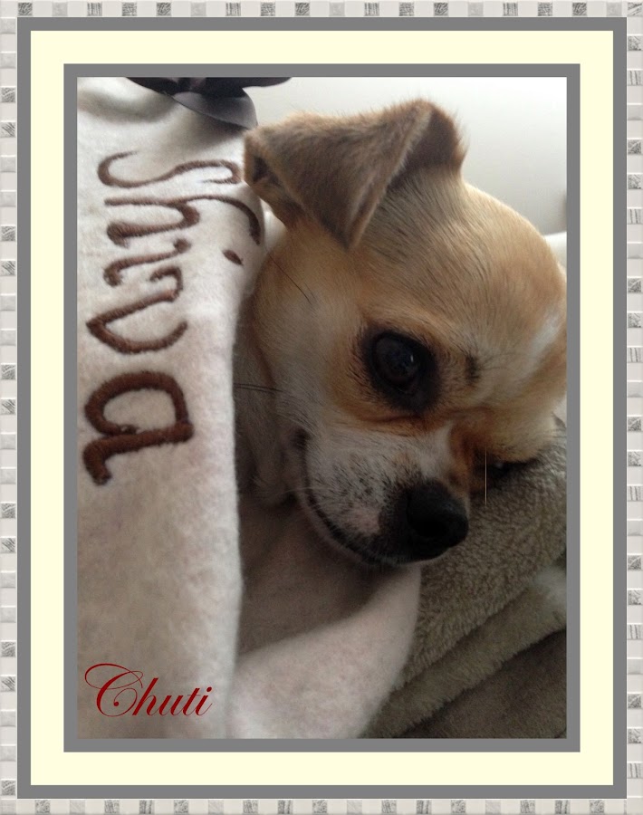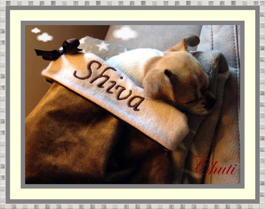Y esto fue lo que se le ocurrió a Laura para que le hiciese a Shiva, un saquito de dormir para cuando está en el sillón o también para los viajes, a ella le encanta y se encuentra tan agustito, como podéis ver. Por dentro es muy calentito, en lana rosa, y por fuera de terciopelo marrón. Lleva su nombre bordado y un lazo, ¡¡ muy elegante!! ¿ no os parece?