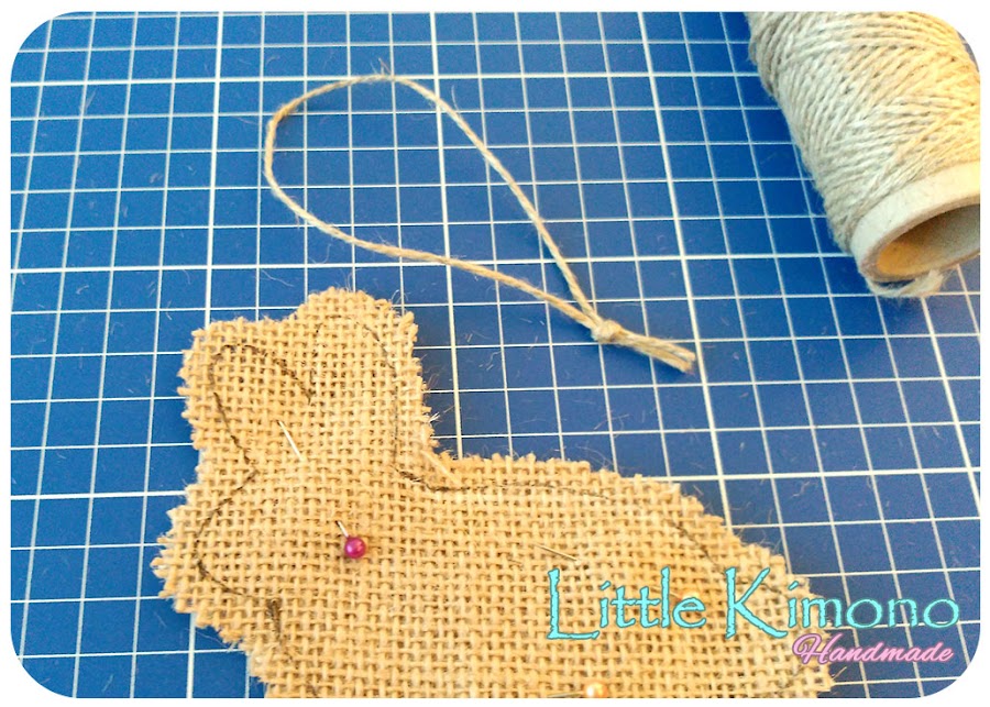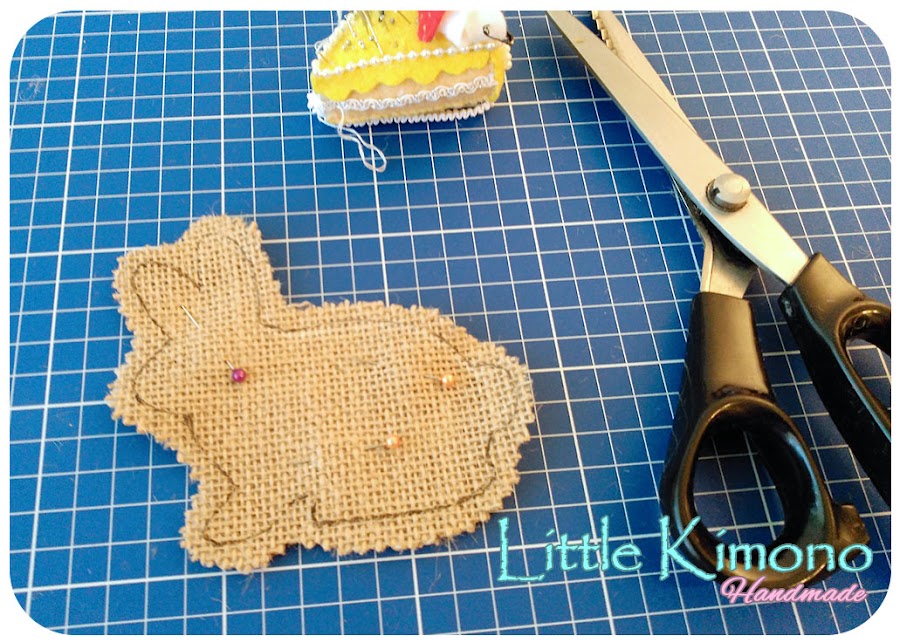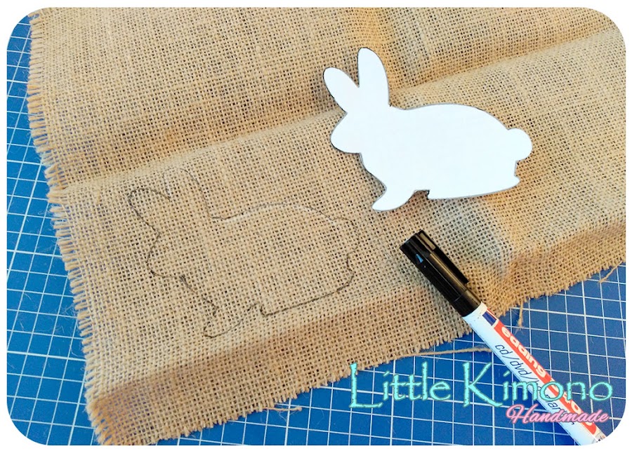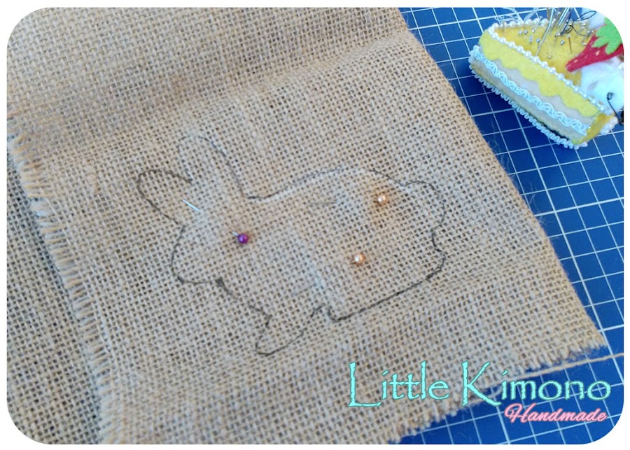 1. Primero descargamos el patrón del conejito AQUÍ imprimimos, cortamos y transferimos el molde a la tela de arpillera.