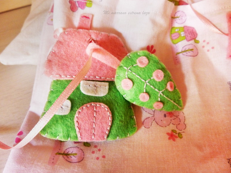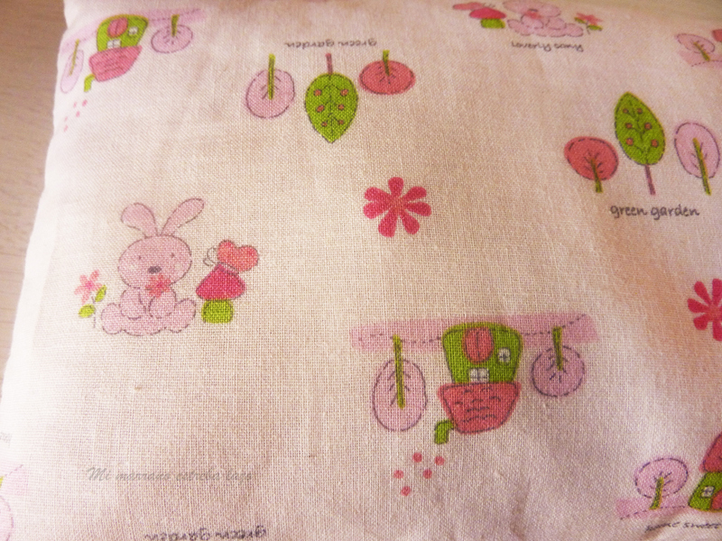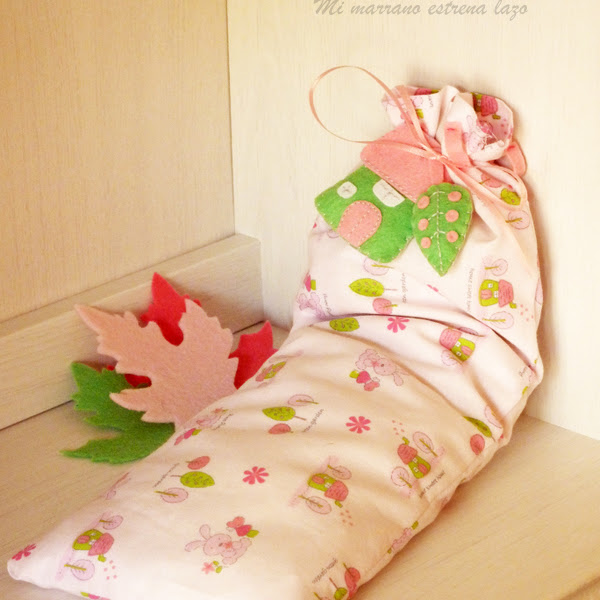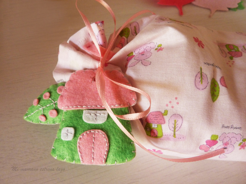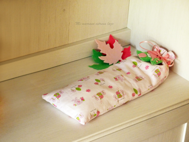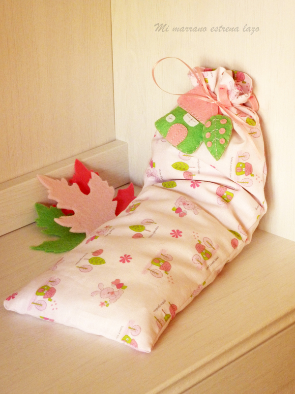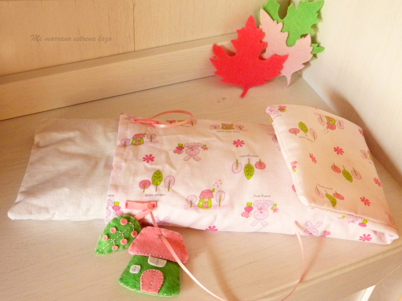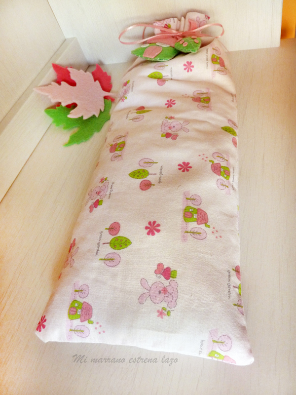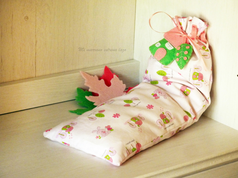 Como veréis en las fotos, consta de dos sacos, uno interior donde están guardados los huesos de ceraza y la lavanda, y otro exterior, que se extrae para poder lavarlo, se ata por la parte superior con un lazo y dos adornos realizados de fieltro, en este caso una casita y una hoja, haciendo juego con el estampado de la tela. Hay un saco igual con la tela en azul y lleva de adorno una casita y un conejito.