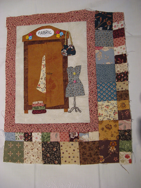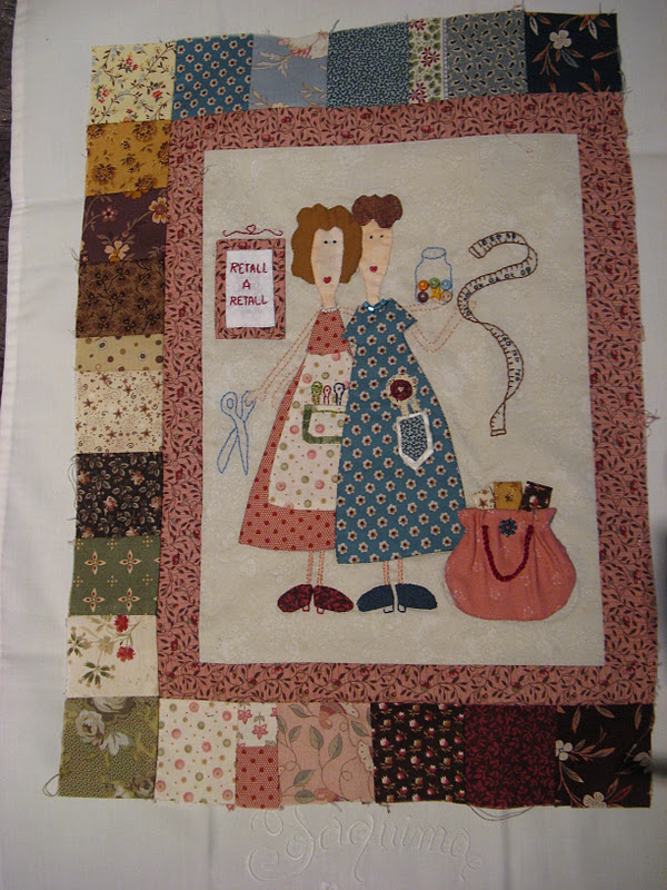 Aquest es el primer que ens va proposr la Sara i he de reconèixer que s"hem va entrevassar una miqueta ............ no sé si serà per els detallets que portaba o que jo amb les aplicacions a puntada amagada encara no hi estic massa avesada i sobretot aquesta bossa que hi ha de robes ............... vaig veure en una de les fotos dels blocs ja fet, que una l"habia fet amb una mica de volum i com que m"encanten aquestes cosetes vai voler fer-li , però .................. no hi habia manera de donar amb la forma ........la vaig intentar de fer Una vegada i res .........fiasco total ,...... segona vegada ...........tampoc donaba amb el patro .....aixi que una mica desencatada la vaig deixar tota la semana en repós; cres que hasta hem feia pànic tocar-la , però com que sòc molt tossuda .............el diumenge passat hem va venir l"inspiració divina ..............no va quedar tan ben feta com la meva font d"inspiració però estic contenta del resultat.