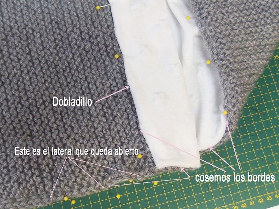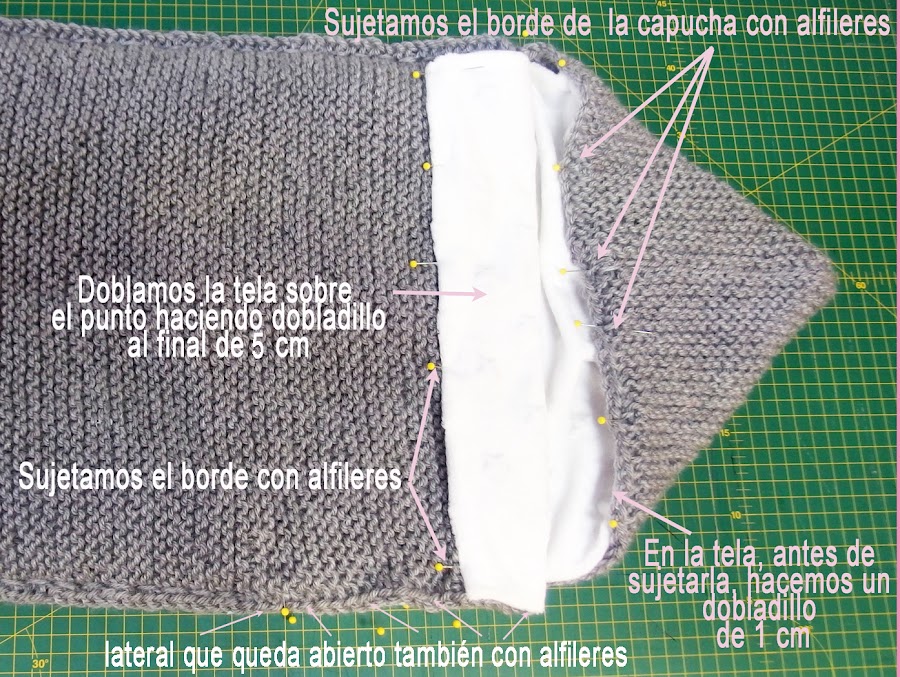 PASO 2: Ahora teneos que coger los bordes con alfileres. El saco de tela, en la parte interior queda suelto. Solo tenemos que sujetar el borde de la capucha, La parte del lateral que queda abierta y lo que sería el embozo. Lo hacemos de la siguiente manera. En todos los bordes de la tela que vamos a coser, sujetamos con alfileres a la lana teniendo cuidado de doblar la tela hacia dentro 1 cm (a modo de dobladillo). En el lateral que queda sin coser, sujetamos por un lado la parte superior de la tela a la parte superior del punto, y por el otro, la parte inferior de la tela a la parte inferior del punto, es decir, teneos cuidado de no cerrar la abertura que hemos dejado, para que sea más fácil meter y sacar al bebe. La parte del embozo, recordemos que la tela en la parte de la abertura superior era 10 cm más larga que el punto. Esto es porque ahora doblamos la tela sobre sí misma durante 5 cm, colocamos sobre el punto y sujetamos con alfileres (para que en el embozo se vean 5 cm en total de tela pero nos quede del derecho), es decir, como si hiciésemos a la tela un dobladillo de 5 cm. Cosemos todos los bordes que tenemos sujetos con alfileres con hilo normal a mano para que no se nos deforme el punto con la máquina.