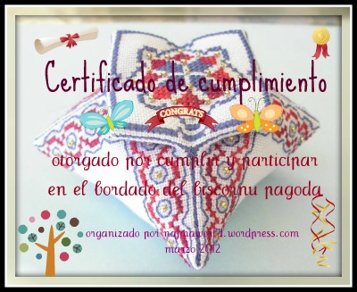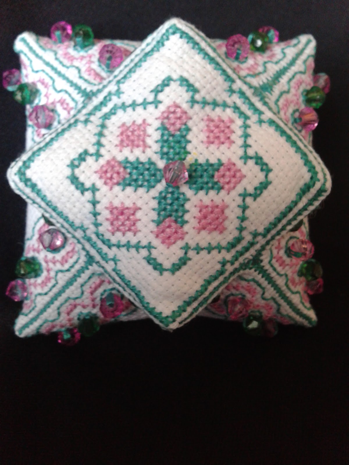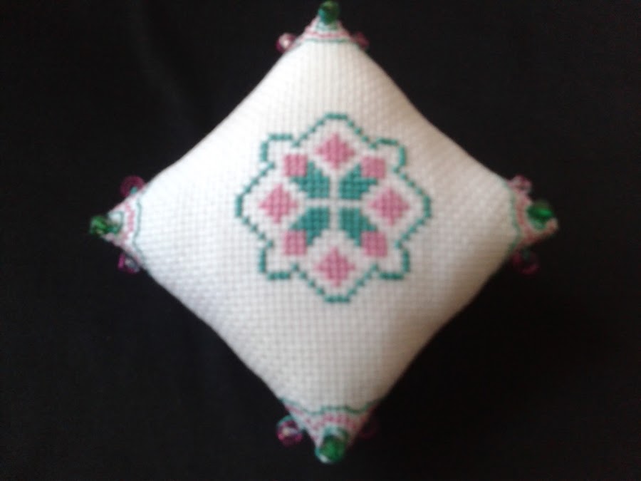 Esta vez se trataba de hacer una PAGODA , no deja de ser un acerico, a modo de biscorniu, pero un poco mas elaborado y adornado con unos abalorios en los mismos tonos que los hilos DMC empleados