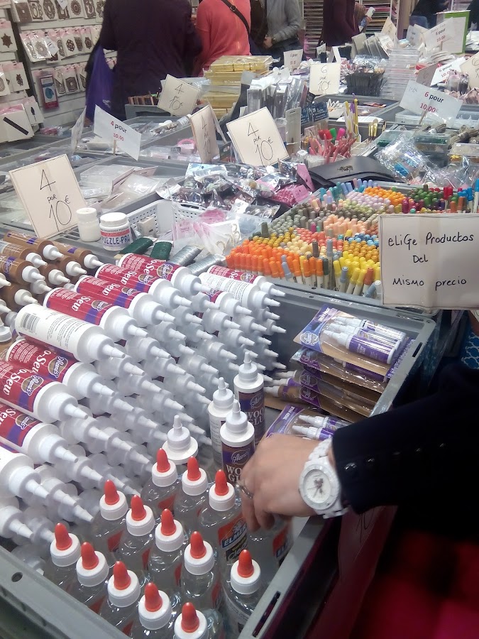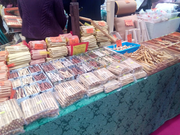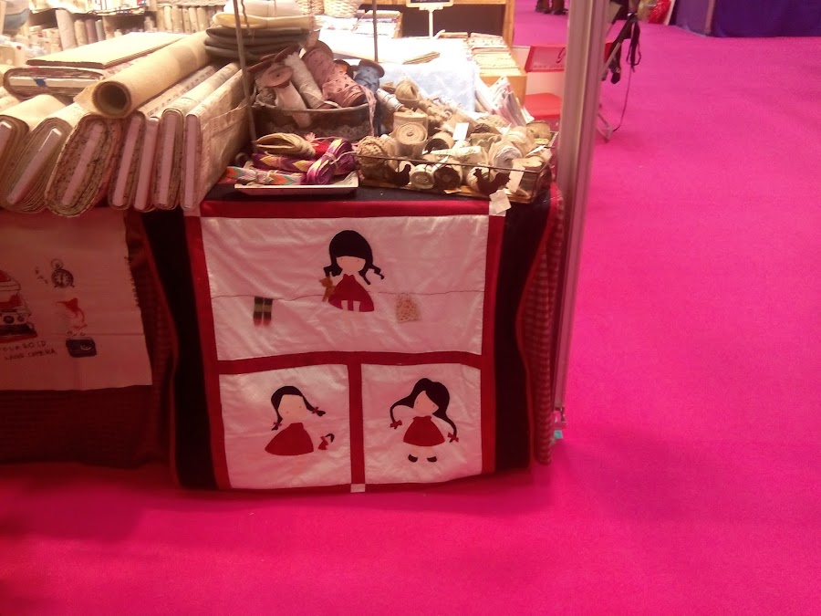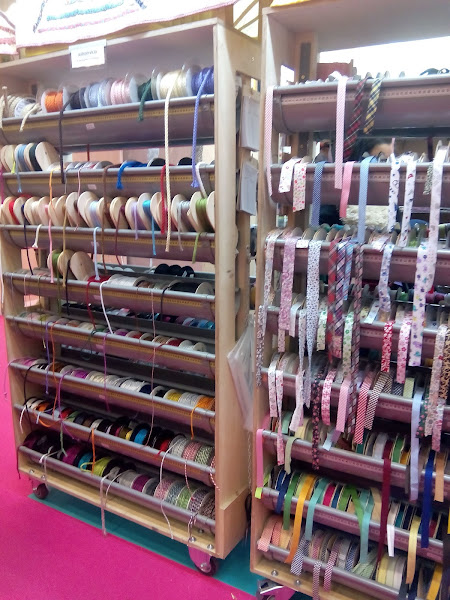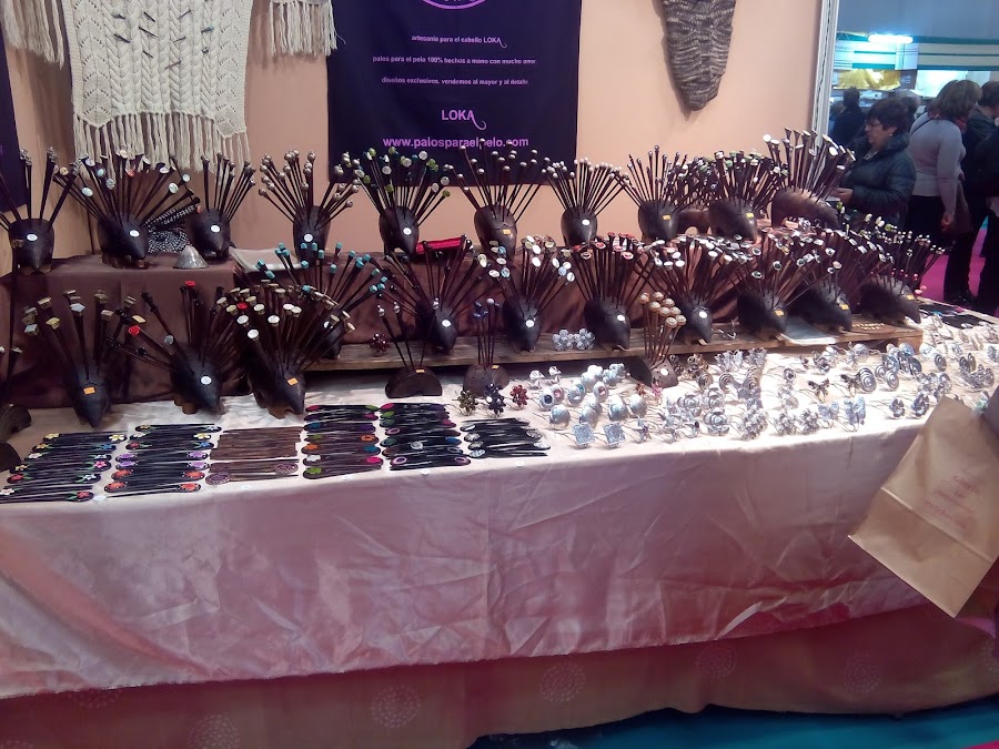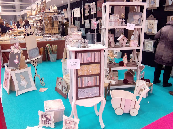 Habia stands de lanas, punto de cruz (cada año menos), patchwork, scrap, accesorios bisuteria... os podeis imaginar, una tentación a cada paso. Lo más entretenido este año, el "hombre de las peonzas", un artesano que con un torno daba forma a un trozo de madera, con una maestria que solo da los años, habria estado todo el día viendo como trabajaba.