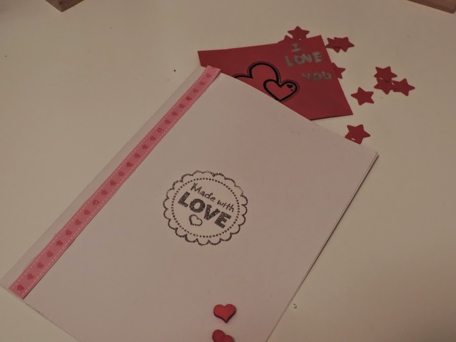 Ahora ya es cuestión de imaginación y lo que querais añadir en el lado donde hemos puesto el sello de purpurina , yo he utilizado unos corazoncitos de madera y una tira de un papel de scrap muy amoroso que tenia en casa .