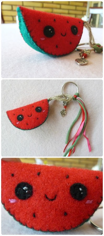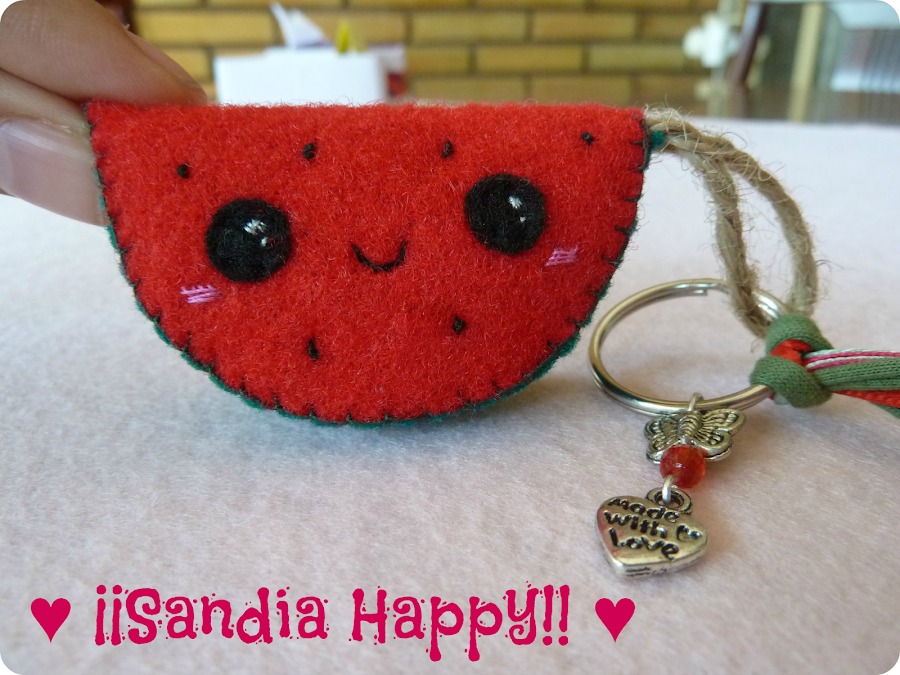 Esta hecha de fieltro y relleno de cojín y, como creo que se aprecia, es una pequeña sandía en 3D blandita blandita! que además, es un llavero. Es chiquita, pero en mi opinión bien mona, así que me parece una justa participación para el reto amistoso nº 66, con el tema "A la rica fruta" que este mes ha organizado el blog "Churras y merinas manualidades". Espero que os guste y, por supuesto, como siempre os animo a ver el trabajo de las demás participantes :)
