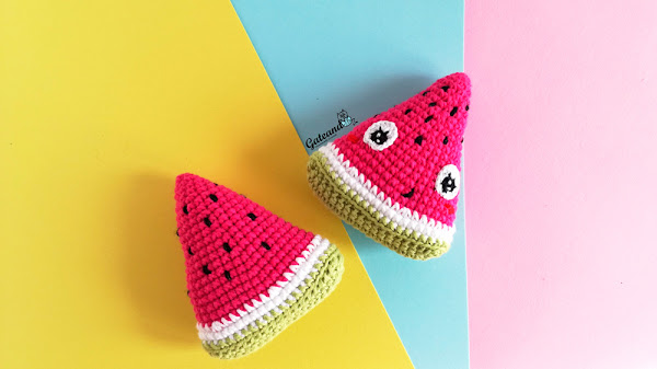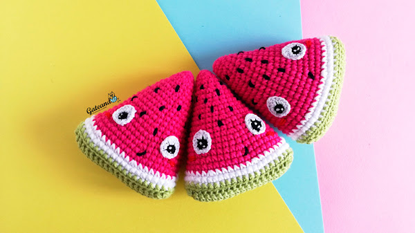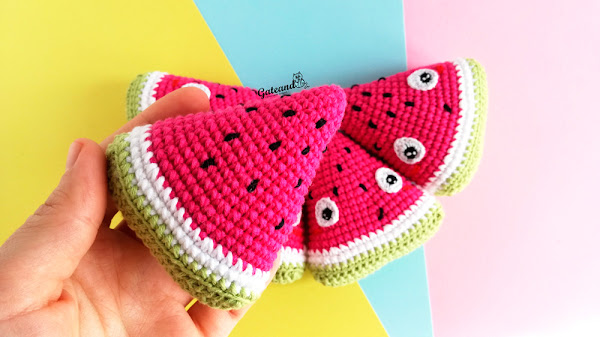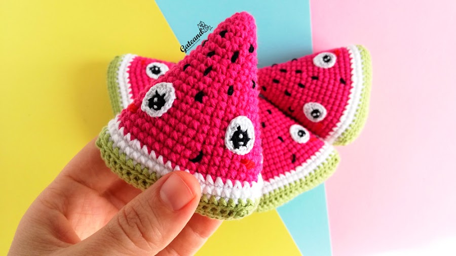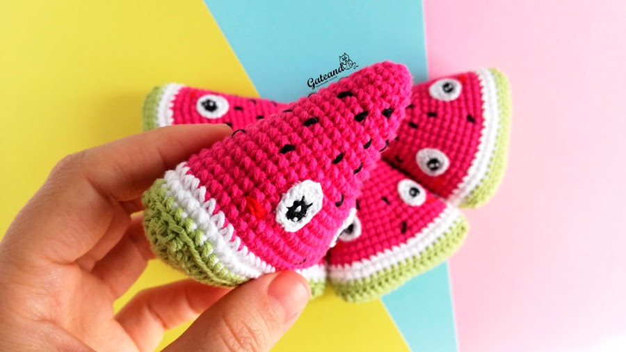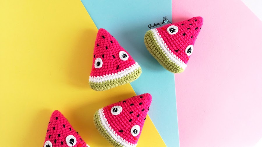 What do you think of my new gang; funny, right? With this heat you have to be distracted with something refreshing, and what better, than these super nice pieces of watermelon. Crocheting these little has been a lot of fun. Here I leave a few pictures for you to tell me what they look like.