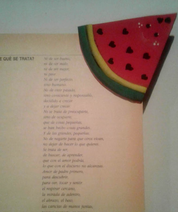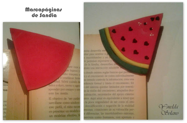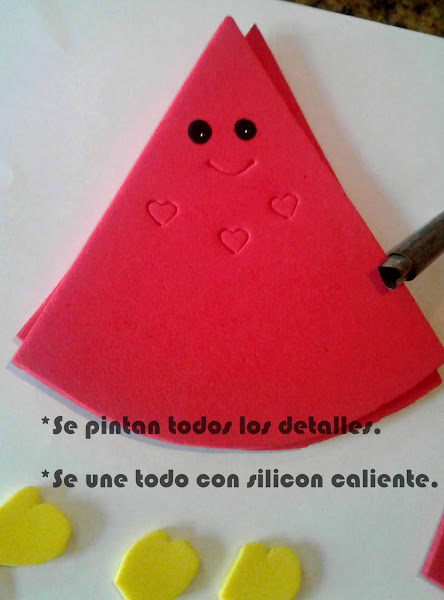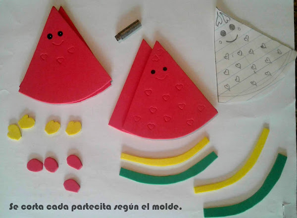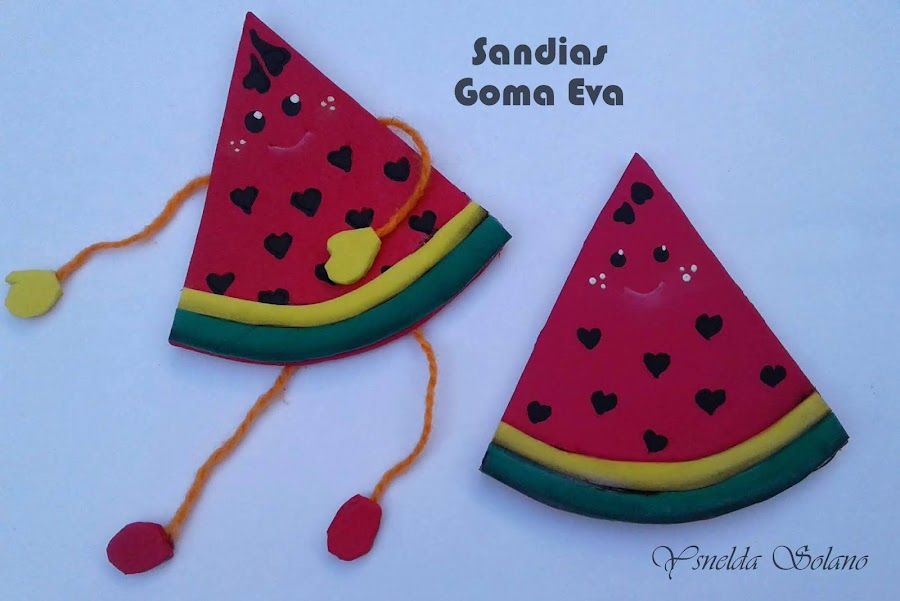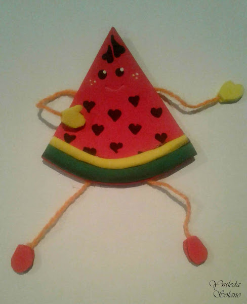 Estas pequeñas sandias podemos usarlas para (1) decorar superficies metálicas, como la nevera o frigorífico. (2) Como un practico portapáginas para nuestros libros. Los materiales son muy sencillos: goma eva de tres colores, roja o fucsia, amarilla o blanca y verde, estambre o lana. Pinturas acrílicas, Silicona caliente y mucho entusiasmo.
