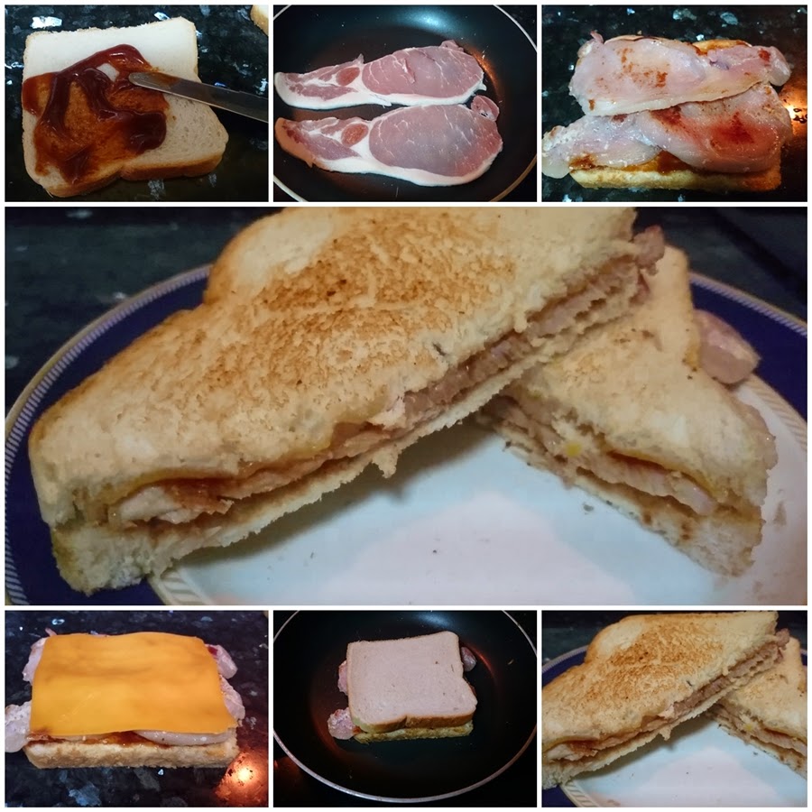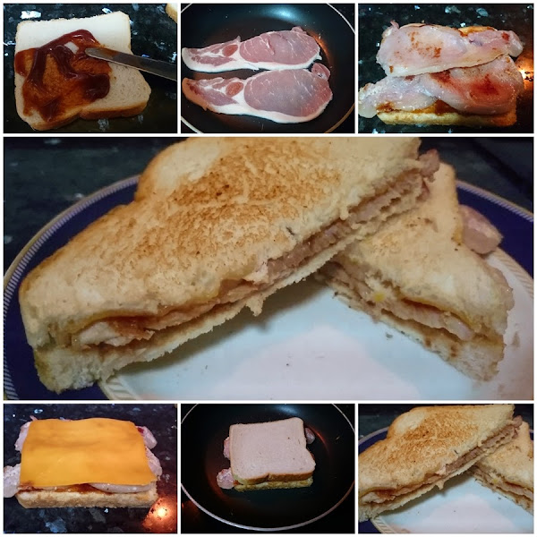 Le pongo salsa barbacoa (HP), paso el bacon inglés por la sartén (sin aceite), añado una buena loncha de queso cheddar y de nuevo a tostarlo en la sartén....uhmmmmmm.