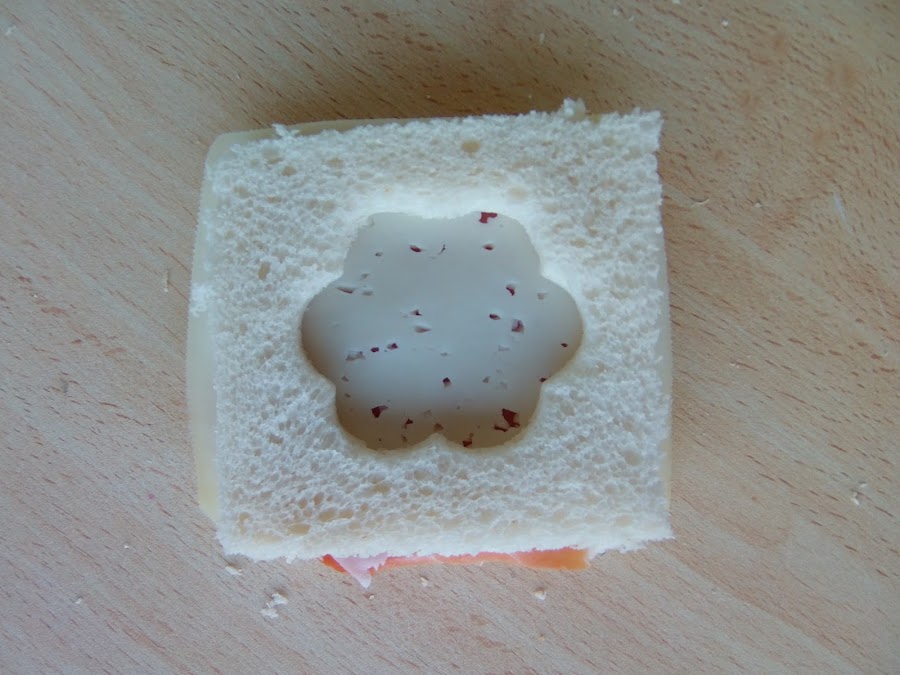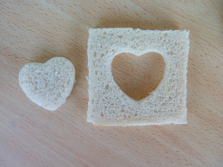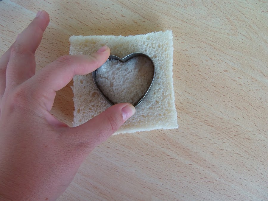 Con el cortador que mas te guste,corta justo en el centro de la rebanada del pan.No tires los restos!