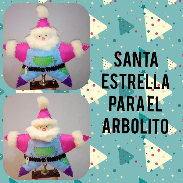 Detalle del Santa Estrella con su uniforme de trabajo en su taller, en el cinturón tiene algunas herramientas y en la parte de atrás, posee una cinta para colgar en la punta del árbol o en sus ramas.