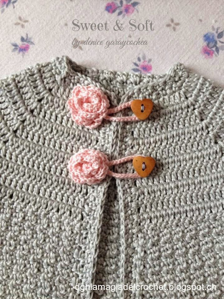 Para la rosa vamos a tejer 30cadenitas, damos vuelta al tejido y hacemos 30pb, al finalizar volteamos el tejido y comenzamos haciendo en el primer punto 5pa,1pb, 5pa, 1pb, 5pa, 1pb...hasta terminar la fila, cerramos y enrollamos, le damos unas cuantas puntaditas para que no se abra la rosa una vez formada nuestra rosita tejemos 20 cadenitas unida a ella para formar el lacito que se enganchará al botón, y para fijarla en el saquito.