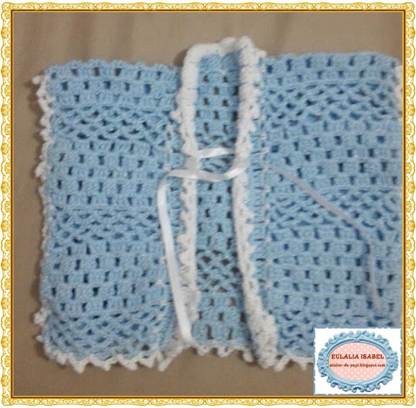 Saquito tejido en lana fina, color celeste, y blanca.