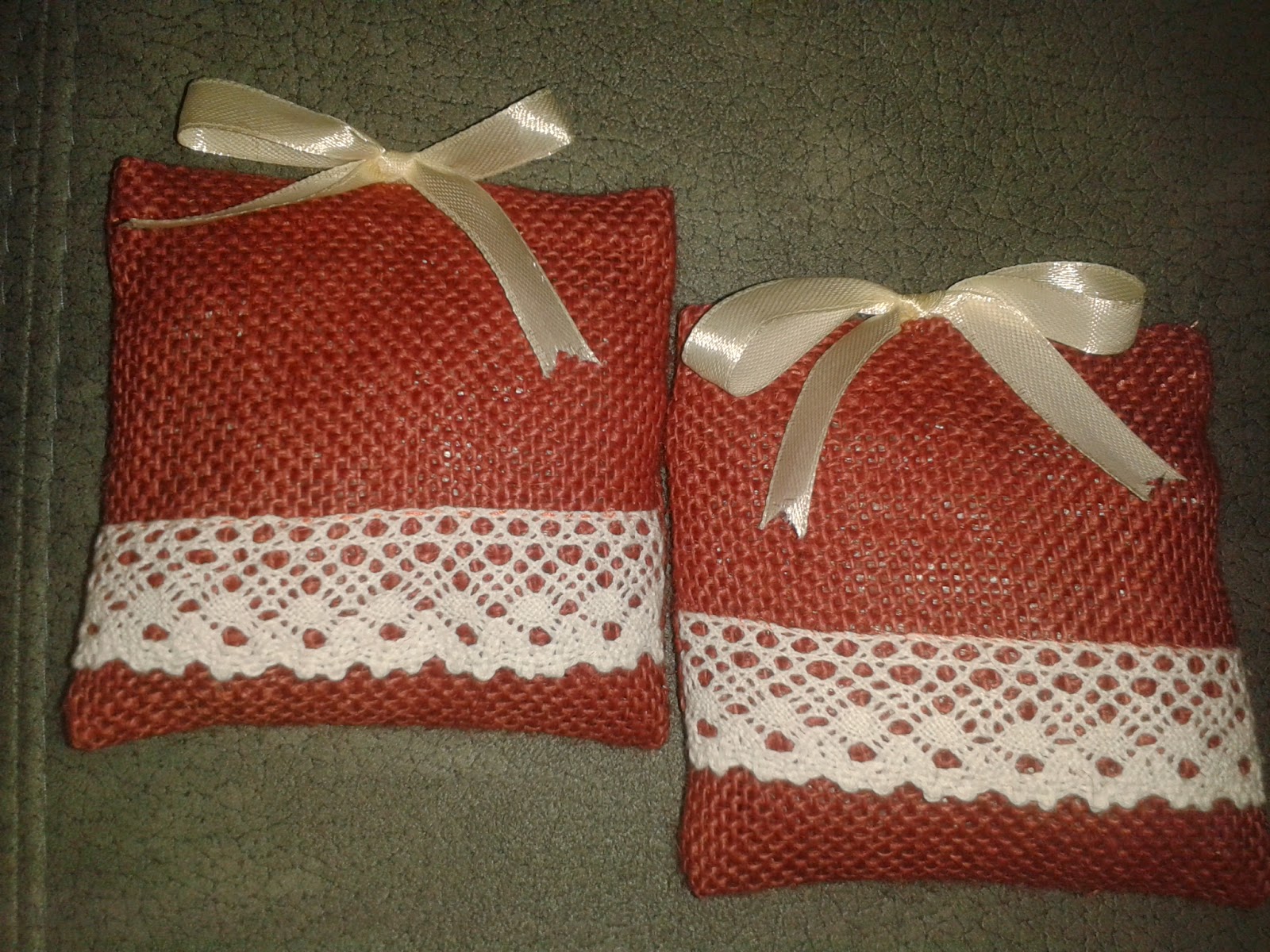 Están confeccionados con tela de yute y estos, van rellenos de lavanda, para que los armarios tengan un olor muuuuuy agradable y fresco! ! Se puede poner dentro cualquier otro tipo de ambientador, jabón e incluso, si los dejamos abiertos se pueden usar como bolsa para guardar detalles ;) sería un regalo doble... regalamos el contenido de la bolsita y el continente, la bolsita en si!!!! Siii :D