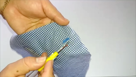 Metemos por uno de los ojales la cinta con ayuda de una horquilla o imperdible o cualquier otro artilugio que te facilite la labor, y la sacamos por el mismo ojal por donde la hemos metido. Nos quedará una cosa así: