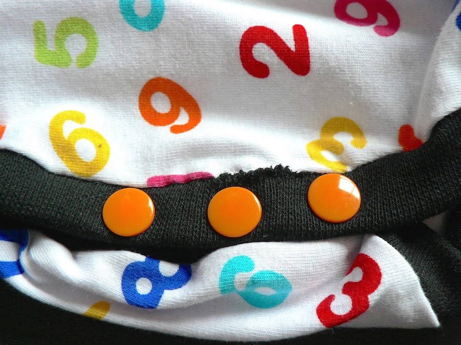 Al blanco con números le hice el bajo diferente y me dio muchos problemas. Quise hacer un bajo de puño y los snaps no funcionaban, no enganchaban. Tuve que ponerle un trozo de tela plana por dentro para que engancharan los snaps porque se abría la tela. Aún así, me quedó mal porque no me cogió bien toda la tela y tuve que darle unas puntadas a mano. A ver si resiste, si no tendré que desmontarlo y volverlo a hacer.