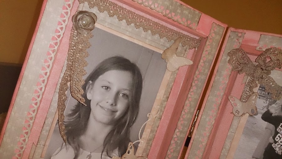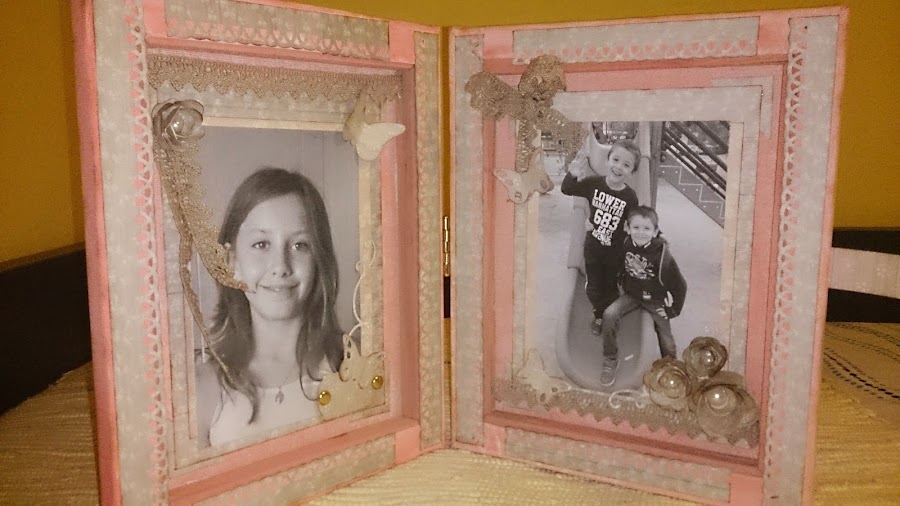 Después para tapar las grapas que llevan los lienzos por dentro, decoramos con cenefas todos los bordes y enmarcamos las fotos que pondríamos y decoramos a nuestro gusto.