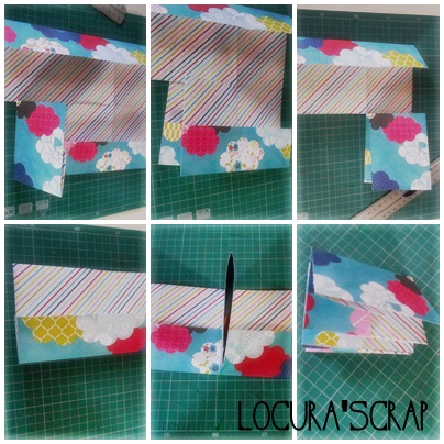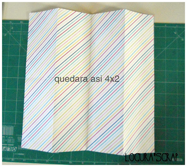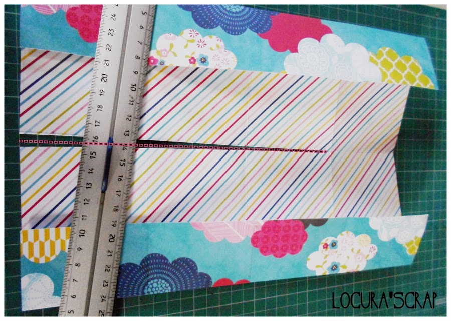 y ahora , igual que se ve en la imagen doblamos de uno y otro lado 5cm ( tener en cuenta que esos serán los bolsillos de dentro del álbum , mirar bien que lado os gusta mas para la portada y cual para dentro ).