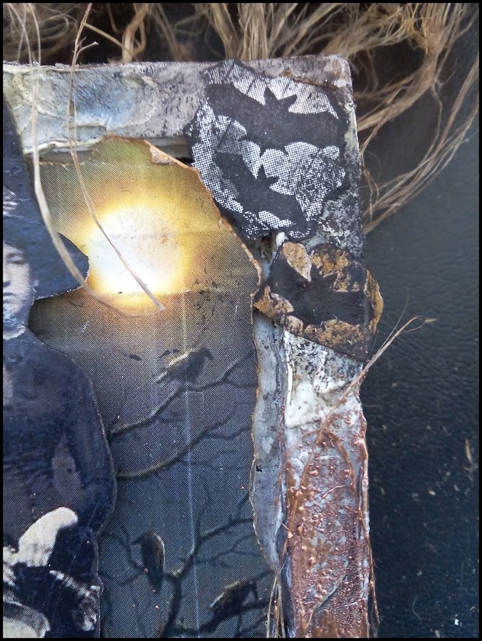 Quemé los bordes y los doble por algunos lados, para que al pegarlo no quedase tan plano, para dar volumen.Lo pego sobre mi base de cartón con gesso.