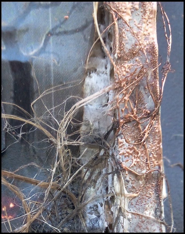 Con polvos de embossar en color bronce hice un embossing en algunas zonas y algunos hilos de la estopa que uso también como adorno, se quedaron pegados, el resultado no fue a propósito, pero creo que quedó genial.