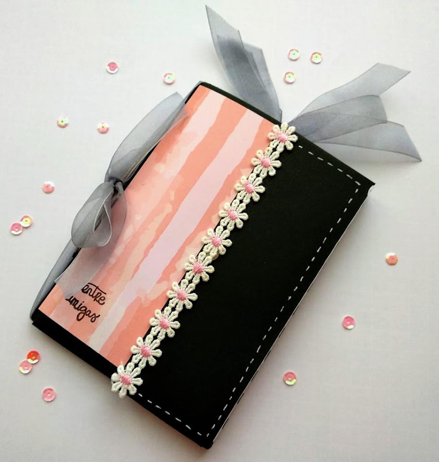 Así quedó el mío después de hacerlo con los condicionantes de: estampar sellos, poner un imán, hacer un desplegable... Pero de él hablaré otro día en el que os enseñaré el paso a paso.