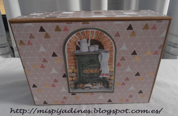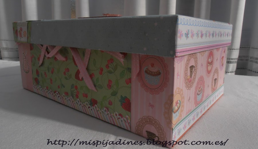 En el interior hice los separadores con cartón y decorados con papel, para sujetarlo les hice agujeros a ambos lados y con un lazo van atados al borde de la caja