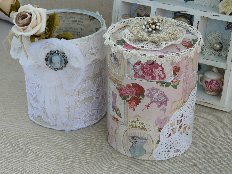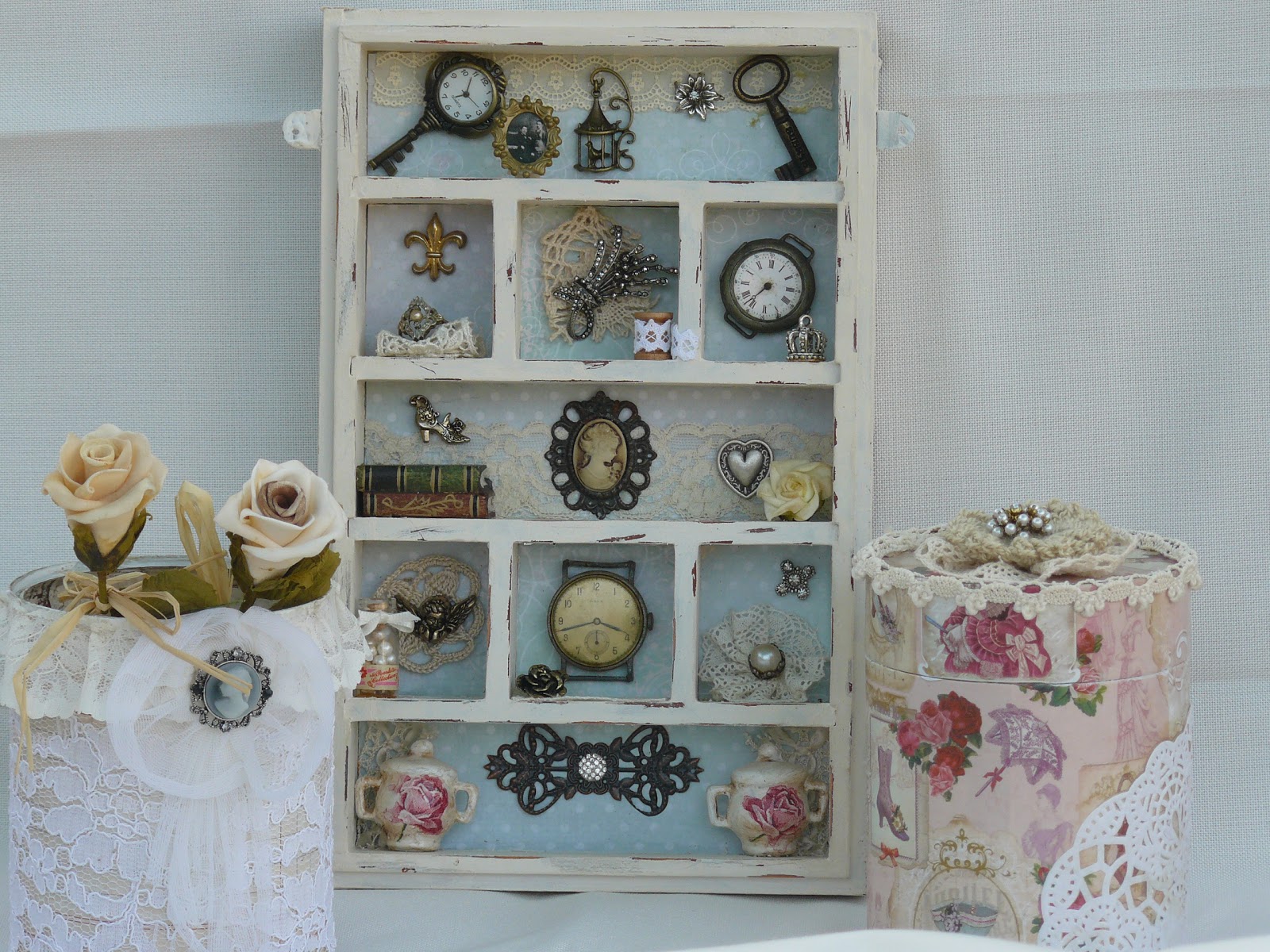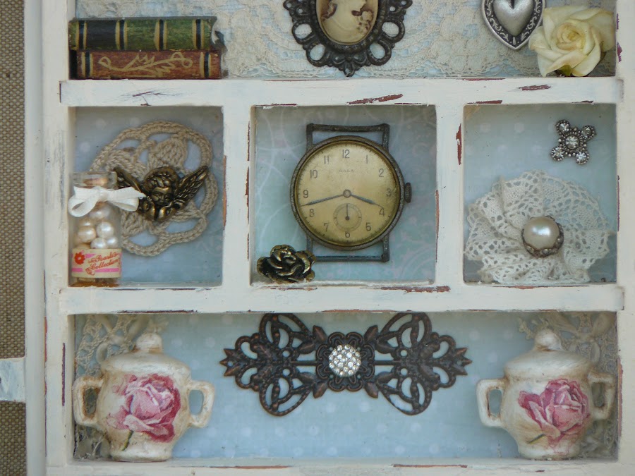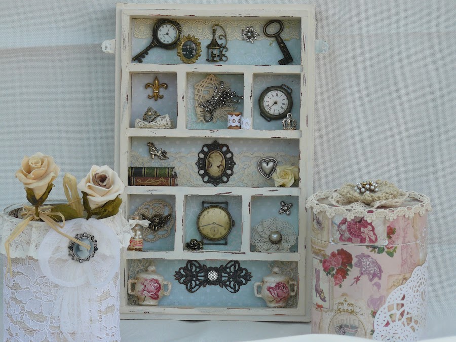 Me he tomado unos dias de descanso con la brocha y he preparado dos cajas para regalar , una lata para poner sobre mi cómoda y un cuadrito , en el que vereis , me he vuelto un poco loca colocando cosillas que tenia olvidadas en una caja.