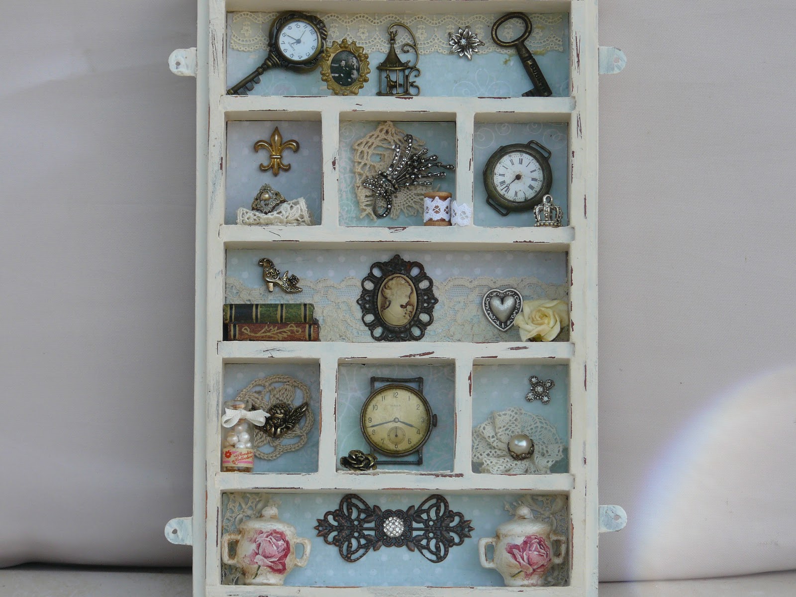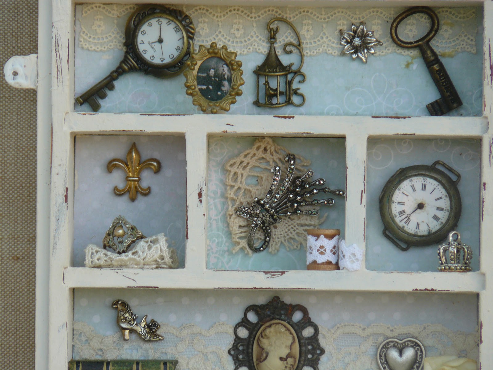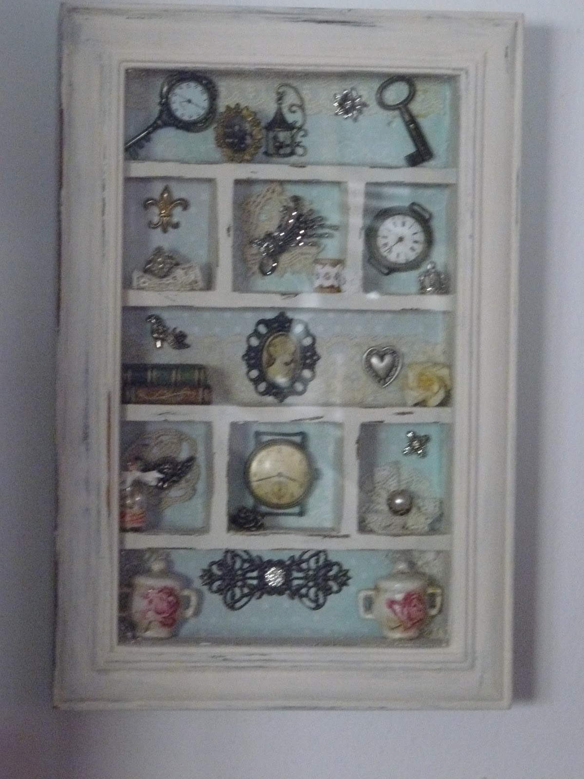 Me he tomado unos dias de descanso con la brocha y he preparado dos cajas para regalar , una lata para poner sobre mi cómoda y un cuadrito , en el que vereis , me he vuelto un poco loca colocando cosillas que tenia olvidadas en una caja.