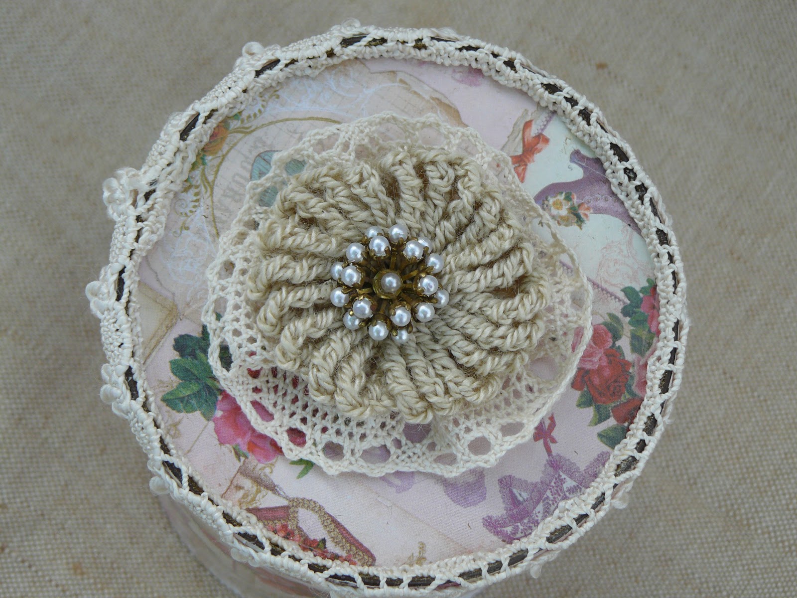 La siguiente se irá de viaje uno de estos dias, espero que a la destinataria también le guste. En la flor que lleva en la tapa he puesto un botón antiguo que me tiene enamorada,