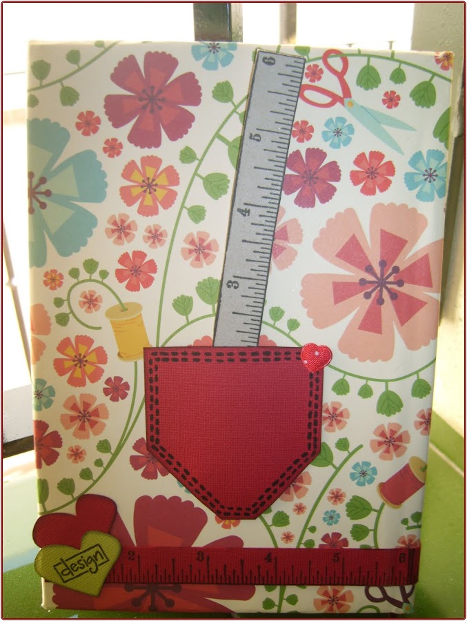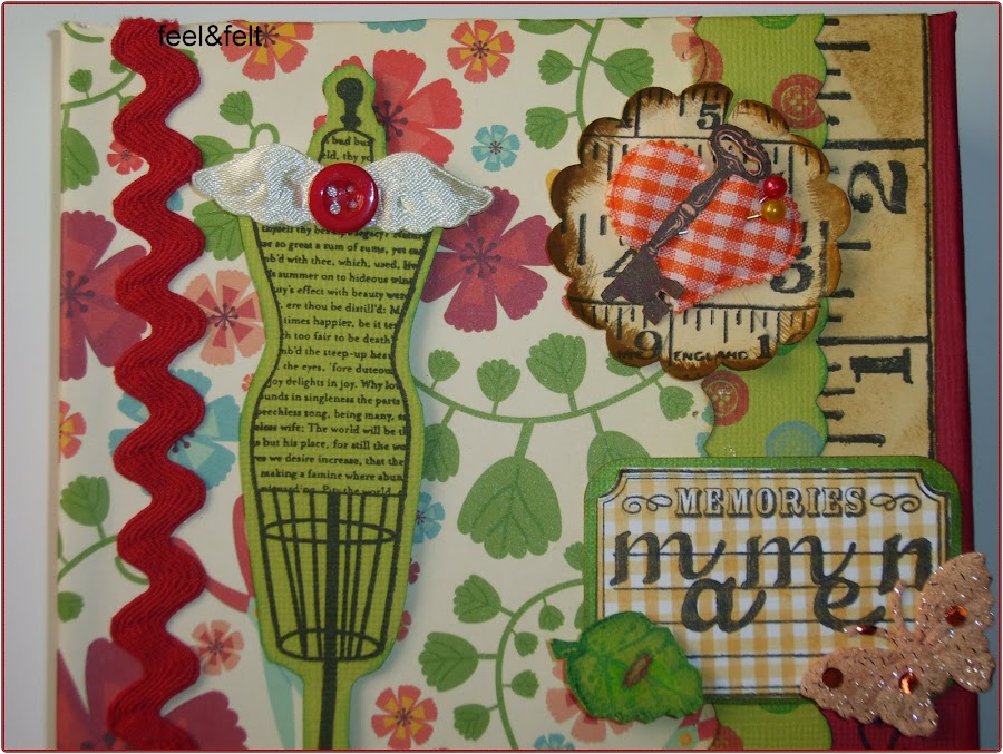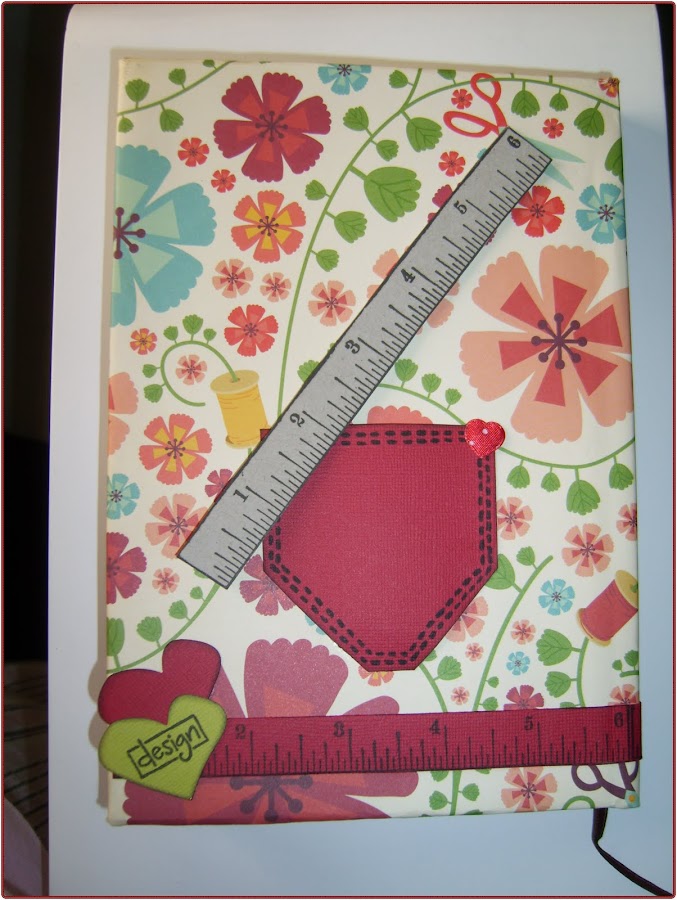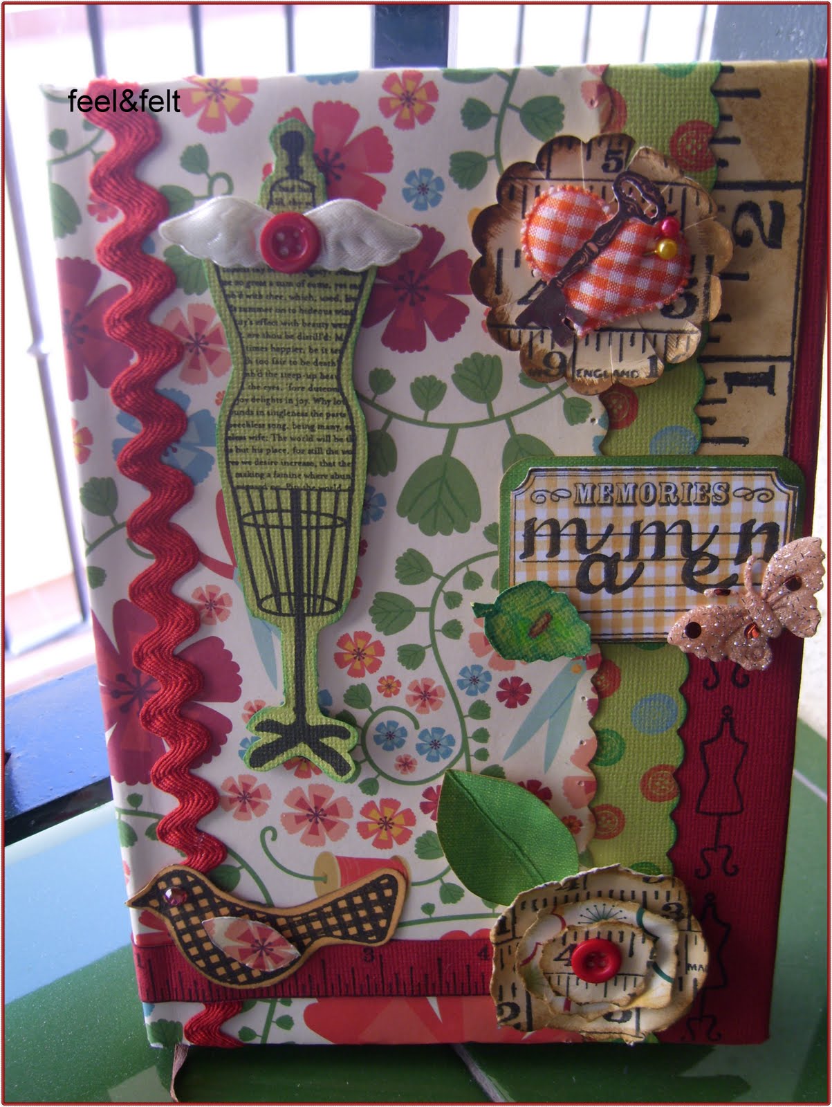 A continuacion os muestro una agenda. Como Mamen se dedica a la costura, procuré personalizarla lo mas posible. Aqui teneis sellos para aburriros, la flor esta hecha con sello de fondo de medidas, la regla, el maniquí que lleva alas, los maniquís sobre fondo rojo, los botones sobre cartulina verde, el pajaro, la llave, la hoja boton verde....y no sigo!