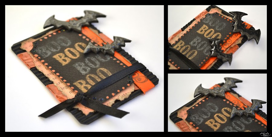El cartelito negro con Boo Boo, es un papel Canson negro para pintura al pastel colocado en el lado grano, la palabra Boo es un sello de la colección Halloween Night de Fiskars, que han sido estampados con Distress Embossing Ink y luego empolvados con Perfect Pearl naranja y gris (habría quedado estupendo con embossing pero de momento esperaremos a los Reyes Magos con la pistolita)