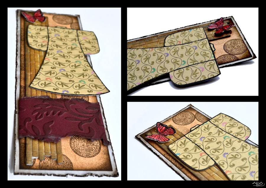 La base es una cartulina blanca que he entintado con tinta cobre Aladine, rasgado los bordes a tijera y entintados para envejecer con Distress Walnut Stain. El fondo es una cartulina de color vainilla oscuro a la que le he estampado con la misma Distress unos sellos de motivos orientales de la pequeña colección Asia de Aladine.